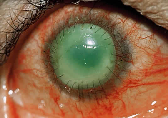 After severe acid burns, corneal and conjunctival epithelium may rapidly become opaque and white. With nitric or chromic acids, these tissues may turn yellow or brown. Necrotic epithelium desquamates within the first few days, leaving a clear corneal stroma and a chemotic, hyperemic, hemorrhagic conjunctiva. Often the exposed stroma has a grayish, ground-glass appearance. Even when the cornea remains clear for the first few days, it may eventually opacify or perforate (Fig. 7). In these cases the prognosis is poor if the peripheral cornea is invaded rapidly by vessels and inflammatory cells. The most severe acid injuries are frequently indicated by complete corneal anesthesia, perilimbal pallor, and a florid iridocyclitis.
