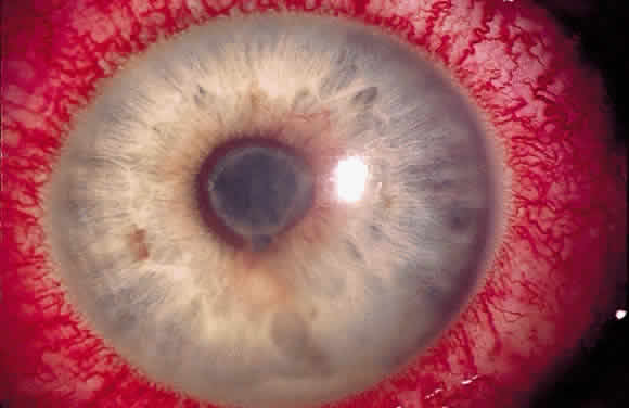 In cases of chronic iritis, tiny refractile crystals may be seen on the surface of the iris, probably representing Russell bodies16,17 (Fig. 9). The iris of patients with chronic iritis may demonstrate prominent iris vessels that follow the normal anatomy. These congested normal vessels must be distinguished from neovascular rubeotic vessels, which tend to arborize at random. Clinically, it may sometimes be difficult differentiate the two, and both types of vessels leak on fluorescein angiography.18