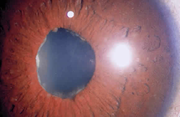 The iris often becomes atrophic in patients with chronic iridocyclitis. Atrophy of the posterior pigmented epithelium of the iris is more common in herpetic uveitis and may result in iris transillumination defects (Fig. 10). Anterior stromal atrophy is more characteristic of Fuchs' iridocyclitis and often results in heterochromia. The irides should therefore be examined by external inspection with the room lights on to document any heterochromia and at the slit lamp to document transillumination defects.
