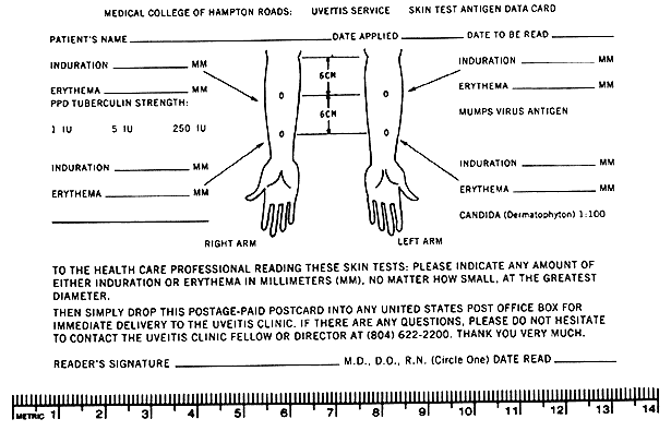 SKIN TESTING FOR DELAYED HYPERSENSITIVITY Intradermal injection of 0.1 ml of soluble antigens prepared from a number of infectious agents can be performed in the office during the initial visit. The most useful test antigen is the tuberculin purified protein derivative (PPD). The standard dose is 5 TU (US tuberculin units) or intermediate strength, equivalent to 0.0001 mg (Aplisol, Parke-Davis, Morris Plains, NJ). Current lots of PPD are standardized for biologic activity against PPD-Seibert (PPD-S), a reference bulk lot prepared in 1940. Second strength (250 TU) can be given to patients who do not react to an initial 5-TU injection, whereas first strength (1 TU) should be given to patients who the clinician suspects may have a strong reaction and are therefore at risk for sloughing and ulceration at the injection site (Tubersol, in first and second strength, available through Squibb/Connaught, Princeton, N J). There is no evidence of booster effects or repeated skin testing leading to conversion from negative to positive.4 Intracutaneous injection, the Mantoux test, is the most reliable test available. Injection of 0.1 ml of PPD antigen into the volar or dorsal surface of the forearm is made just below the skin surface with a short (1/2-inch) No. 27 gauge needle, bevel upward, to produce a discrete 6- to 10-mm wheal or bubble. The use of insulin syringes with intrinsic needles will avoid repeated waste of antigen extract in the needle hub of standard tuberculin syringes. If no bubble appears due to a deep injection, the test should be immediately reapplied at a site at least 5 cm away. Skin tests are read 48 to 72 hours following injection. Induration measuring 10 mm or more is considered positive: this indicates a previous infection with Mycobacterium tuberculosis, although previous infection with M. bovis or photochromogenic mycobacteria may also produce a positive result. Patients may also develop coexistent erythema, a wheal and flare that usually fades after 12 to 18 hours, which is evidence of an immediate hypersensitivity to the same test antigen. Uveitis patients with induration less than 10 mm, or even erythema alone, have had favorable clinical responses to oral antituberculous therapy.5 On the other hand, patients with proven ocular tuberculous infection have had insignificant6 or negative7 PPD skin tests. Other commercially available skin test antigens include histoplasmin (Parke-Davis, Morris Plains, N J) and coccidioidin (Spherulin 1:100, Berkeley Biologicals, Berkeley, CA). Although the use of histoplasmin skin testing in uveitis is no longer universally recommended, greater than 80% of patients with presumed ocular histoplasmosis syndrome have positive skin tests.8 Some authors believe that histoplasmin skin testing may increase the danger of activating a macular lesion in susceptible patients. Skin test reagents for other infectious diseases are not commercially available and must be obtained through individual laboratories actively engaged in production and purification of the specific antigen. These include brucellosis, tularemia, blastomycosis, toxoplasmosis, nontuberculous mycobacterial disease, and cryptococcosis antigens, all of which are subject to strict safety controls limiting their use.9 Control antigens to which normal, presumably exposed, adult patients should react, include Candida extract (Dermatophyton O, 1: 100, Hollister-Stier, Spokane, WA), Trichophyton, mumps, and streptokinase-streptodornase (Lederle Diagnostics, Pearl River, NY). Patients with sarcoidosis and a number of other conditions (Table 3) are often anergic to all skin test materials.10 In patients taking corticosteroids, a negative test should be repeated or delayed until the medication is discontinued because systemic corticosteroids may reduce or eliminate all skin test reactions. A positive test, however attenuated, is still significant in patients on oral corticosteroid therapy. A self-addressed postcard clearly diagramming the position and dosage of all skin tests applied can be expeditiously returned after 48 hours by patients who do not have convenient access to the uveitis clinic (Fig. 1). Skin tests should be read only by health care personnel who understand diameter measurements of erythema and induration.