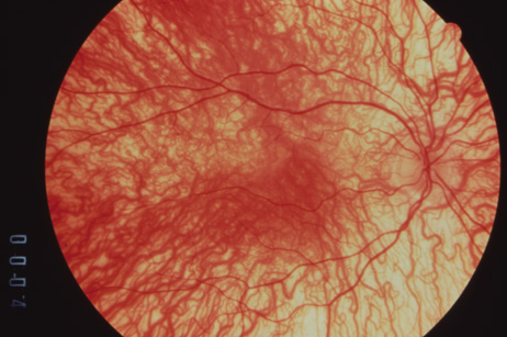 The ocular manifestations of patients with albinism vary in severity among the different types of this heterogeneous group of conditions but share characteristic common features.31 Sensory nystagmus is present very early in life but improves in amplitude and frequency with increasing age. This is frequently the presenting sign of the disorder. In most cases the nystagmus is pendular and horizontal. Occasionally a null region and compensatory face turn may be present. A detailed discussion of eye-movement abnormalities in patients with albinism is beyond the scope of this review. Reduced visual acuity is present from birth, and ranges from 20/40 to 20/400 in most cases. Vision usually remains stable, but may improve slightly with age in some patients. Poor binocular vision and reduced stereopsis may be present; however, many patients can pass parts of the clinical stereo tests.32 Iris color ranges from light blue with a pink reflex in OCA1A to hazel in other types, and may change as more pigment is deposited with age. Iris transillumination is best detected by means of the slit-lamp and retroillumination in undilated patients. In some cases the outline of the lens can be seen through the iris (Fig. 4). Hypopigmentation of the iris pigment epithelium results in light scatter and contributes to the subjective complaint of photophobia in some (but certainly not all) patients. Fundus hypopigmentation is also variable. A dilated-fundus examination may reveal a prominent choroidal vascular pattern resulting from decreased or absent RPE melanin (Fig. 5). The optic nerve head may be grayish in patients with OCA1A, or it may be hypoplastic (Fig. 6). Absent macular xanthophyll pigment and a diminished foveal reflex indicate foveal hypoplasia (Fig. 7).33,34 The latter is considered one of the main factors underlying reduced visual acuity in albinism. Abnormal macular vascular patterns may be present in which retinal vessels course through the foveal avascular zone instead of arching around it, which is a hallmark of foveal hypoplasia.35 Whether foveal hypoplasia in albinos is directly related to reduced macular RPE melanin is unknown. Optic nerve hypoplasia is a well documented but not very common finding in albinos.36 Megalocornea, aniridia, posterior embryotoxon, Axenfeld's anomaly, glaucoma,37,38 retinal coloboma, and abortive cryptophthalmos have also been reported in rare individual patients, and except for mild anterior segment dysgenesis are probably coincidental.