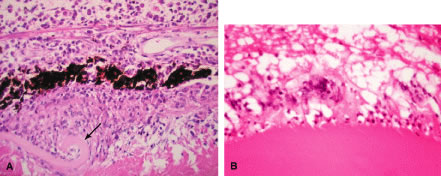 and, thus, warrants inclusion in the category of lens-induced uveitis. Phacogenic nongranulomatous uveitis shares several clinical features with phacoanaphylactic uveitis, including development of intraocular inflammation following traumatic or surgical disruption of the lens capsule, the appearance of inflammation generally within 2 to 3 weeks after the injury, and formation of iridolenticular adhesions. However, phacogenic nongranulomatous uveitis differs from phacoanaphylaxis in some important respects; for example, keratic precipitates are lacking in most patients with phacogenic nongranulomatous uveitis, and those that do form are small and nongranulomatous. Phacogenic nongranulomatous uveitis can be easily mistaken for phacolytic glaucoma, because both of these entities can result in increased intraocular pressure and inflammatory cells in the anterior chamber. However, phacolytic glaucoma occurs only in patients with a mature or hypermature cataract who have no evidence of traumatic or surgical disruption of the lens capsule. Histologically, phacogenic nongranulomatous uveitis can be differentiated from other forms of lens-induced uveitis in that it typically exhibits a nongranulomatous inflammation around the disrupted lens.5 This cellular infiltrate consists of lymphocytes, histiocytes, and some polymorphonuclear leukocytes; epithelioid cells, giant cells, and the zonal pattern are not seen in this entity. The macrophages rarely contain eosinophilic granular material, which is commonly noted in cases of phacolytic glaucoma. The etiology of phacogenic nongranulomatous uveitis is unknown, but because it appears that this inflammation may be a variant of phacoanaphylactic endophthalmitis, it is most likely mediated by an autoimmune process directed to the lens protein. The management of phacogenic nongranulomatous uveitis is similar to that of phacoanaphylaxis. Surgical removal of the lens is essential, as is administration of topical and systemic corticosteroids to suppress the inflammation. |