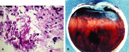 The delayed onset of endophthalmitis from P. acnes infection is believed to be due to sequestration of bacteria within the lens capsular sac.19,26–28 This sac provides a barrier to the spread of organisms into the vitreous or aqueous.17 By the same token, the capsular sac protects the organism from recognition and phagocytosis by circulating mononuclear phagocytes and polymorphonuclear leukocytes. However, when the bacterial growth reaches a certain critical mass and particularly when these organisms gain access to vitreous gel following Nd:YAG capsulotomy, the organisms are freed of the protective barrier of the capsule and are exposed to circulating leukocytes, which leads to the development of intraocular inflammation.19 Furthermore, the mild and chronic nature of the clinical course of most P. acnes infections may reflect the relatively low virulence of these organisms. Patients with delayed-onset endophthalmitis should undergo testing to confirm the etiologic diagnosis by culture methods and by histologic examination.29 Because most of these organisms are sequestered in the lens capsular sac, aqueous cultures may not yield a positive diagnosis. Similarly, vitreous tap specimens from some of these patients may show lack of growth. However, it is still recommended that a vitreous tap be performed in cases of localized endophthalmitis and that the material be used for culture on anaerobic media. Moreover, such cultures should be maintained for a minimum of 2 weeks. Ideally, any surgically removed capsular material should be submitted for culture studies and for histopathologic examination. In addition to anaerobic culture, other media should be employed because organisms such as S. epidermidis and fungi (Figs. 7 and 8) can cause similar localized endophthalmitis.17 Although it is not yet widely available, polymerase chain reaction has been successful in detecting a causative organism, including P. acnes, in culture-negative aqueous and vitreous samples of patients with chronic endophthalmitis.30,31 The treatment of P. acnes-induced endophthalmitis varies depending on severity and extent of intraocular inflammation.29 Mild cases, in which the fundus can be well visualized, are generally managed with intensive topical and systemic antibiotics in addition to intravitreal injection of vancomycin (1 mg) at the time that the intraocular material is obtained for culture. In advanced cases, with poor visual acuity or poor visualization of the fundus, vitrectomy along with injection of vancomycin (1 mg) is advised. In both groups, inflammation will resolve in as many as half of the cases without further surgical intervention.27,32,33 However, the definitive therapy for those patients who do not respond to conservative management includes removal of all capsular remnants, intraocular lens removal or exchange, and injection of vancomycin (1 mg).29 This procedure has been found to be curative in almost all cases.32,33 Because of the localized nature of endophthalmitis, the previously suggested medical or surgical management regimens usually result in marked improvement in visual acuity with up to half of patients retaining 20/40 or better vision.32,33 |