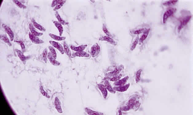 sporozoite. All three forms cause infection in humans. Tachyzoite is the proliferative form of the organism, which used to be known as trophozoite. It has a crescent shape and measures approximately 7 μm in length and 3 μm in width (Fig. 1). The organism is motile with a unique cytoskeletal structure allowing it to twist, wiggle, rotate, and glide. The rostrum of the tachyzoite is known as the conoid, which can extend, retract, tilt, and rotate. These movements allow the tachyzoite to find its target host cell and to penetrate the cell, establishing an intracellular existence. Tachyzoites are easily propagated in peritoneal cavities of mice and in mammalian tissue culture cell lines. The organism has the ability to replicate in all mammalian nucleated cells. In the host cell, the tachyzoite multiplies by endodyogeny; this reproductive process is susceptible to heat, freezing and thawing, desiccation, and gastric enzymes.