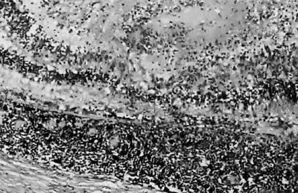 by successive layers of mononuclear cell infiltration (Fig. 15). The cells consist predominantly of lymphocytes and macrophages with
