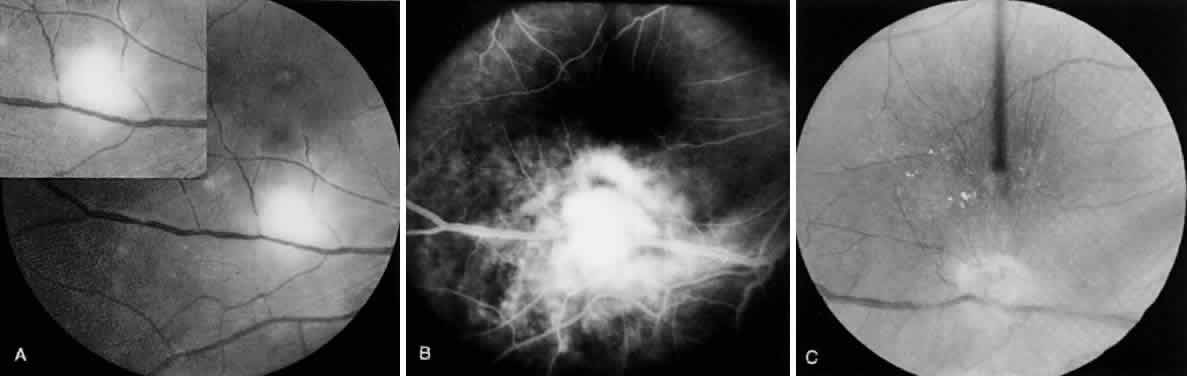 secondary glaucoma in patients with chronic ocular toxoplasmosis. Subretinal neovascularization may complicate the course of Toxoplasma retinochoroiditis. Gilbert72 describes two unusual cases of ocular toxoplasmosis in which the patients developed retinal and optic nerve neovascularization in association with ocular toxoplasmosis. The neovascularization regressed with resolution of the inflammation. The reason for neovascularization of the optic nerve and the retina is not well understood. Retinal ischemia associated with severe retinal vasculitis may predispose to neovascularization of the retina. On the other hand, inflammatory reactions alone may cause neovascularization of the retina. Retinal vasculitis, whether it is arteritis or phlebitis, may lead to retinal hemorrhages.72 Retinal tears may be seen that can lead to rhegmatogenous retinal detachment. Optic papillitis and optic neuritis may eventuate in optic atrophy. Juxtapapillary retinochoroiditis may lead to nerve fiber bundle field defects. The vitreous may show thick, vitreous stands and vitreous membranes that may require vitrectomy. Vascular anastomoses may be seen in patients with ocular toxoplasmosis. Vascular anastomoses between the retinal and choroidal circulation can occur through the damaged Bruch's membrane and fundus scars resulting from ocular toxoplasmosis. Cerebral blindness and oculomotor nerve palsies have been described in patients with ocular toxoplasmosis,73,74 as have retinal branch artery occlusion,75 subretinal neovascularization,76,77 and choroidal vascularization.78,79 Long-term ocular and neurologic involvement may occur in severe cases of congenital toxoplasmosis.16 Atypical forms of ocular toxoplasmosis are observed in immunosuppressed individuals80 and elderly patients.63 TOXOPLASMOSIS IN IMMUNOCOMPROMISED PATIENTS In patients with AIDS, ocular toxoplasmic retinochoroiditis may represent a reactivation of a latent infection or a newly acquired disease. The clinical manifestations of ocular toxoplasmosis in patients with AIDS may be severe. Patients may have single or multiple lesions of retinitis. The disease may be unilateral or bilateral and may present in a fulminant manner. Retinal hemorrhages may occur, and patients may develop papillitis. Toxoplasmosis accounts for 1% to 3% of ocular infections in patients with AIDS.81 A variety of clinical manifestations can be confused with toxoplasmosis, including cytomegalovirus retinitis, herpes simplex, and herpes zoster retinitis. The ocular disease caused by toxoplasmosis may be the first manifestation of intracranial and disseminated T. gondii infection in AIDS patients. Therefore, prompt recognition and early treatment with appropriate antiparasitic drugs will prevent widespread tissue destruction and may decrease the chances of dissemination. Serologic diagnosis of toxoplasmosis in AIDS may not be helpful, and the clinician may have to rely on clinical findings and results of PCR testing. A nested multiplex PCR assay has been designed for the simultaneous detection of Epstein-Barr virus and T. gondii DNA from the ocular fluid of AIDS patients.82 T. gondii DNA was detected in eight of eight patients with toxoplasmic encephalitis and in zero of six patients without toxoplasmosis in patients with AIDS. PCR appears to be a helpful diagnostic test to confirm the presence of toxoplasmosis in patients with AIDS. Optic nerve involvement and papillitis in ocular toxoplasmosis may be the initial manifestations of AIDS. |