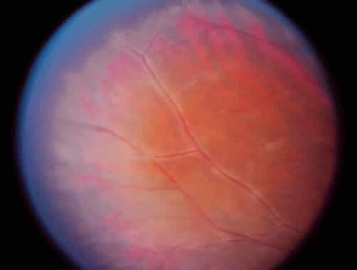 EALES' DISEASE Eales' disease was initially described as recurrent retinal and vitreal hemorrhages, epistaxis, constipation, and headaches in young men.34 It has since been redefined as an idiopathic obliterative peripheral retinovasculopathy with variable degrees of nonperfusion, vascular sheathing, retinal vascular abnormalities, peripheral retinal neovascularization, and hemorrhage (Fig. 6).35 It usually affects men in the third decade of life and is bilateral in up to 90% of cases.36 Many patients are symptomatic in only one eye, but fundus examination of the fellow eye may reveal early changes such as periphlebitis, vascular sheathing, and peripheral retinal nonperfusion.37 The presenting symptom in 90% of patients is a painless blurring of vision, often due to vitreous hemorrhage.36