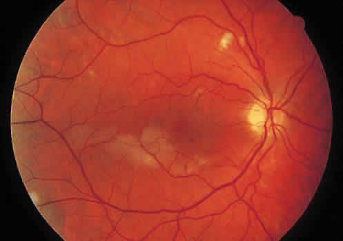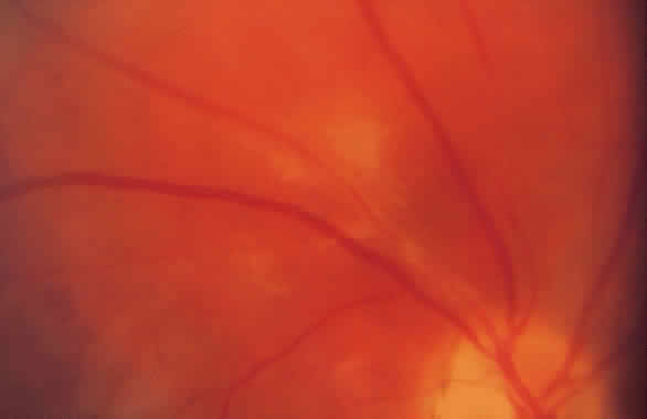| SYSTEMIC LUPUS ERYTHEMATOSUS Systemic lupus erythematosus is characterized by autoantibody formation and small vessel occlusions. Ocular manifestations occur in approximately 15% of SLE patients, with retinal vasculitis reported in 5% of these patients.78 The retinopathy of SLE is primarily a diffuse arteriolar occlusive vasculitis,79,80 and there may be microangiopathy with cotton-wool spots and intraretinal hemorrhage (Fig. 9).81 Patients with only cotton-wool spots have a favorable prognosis.82 However, vaso-occlusive retinopathy carries a more severe prognosis, with about 50% of patients eventually becoming legally blind.83