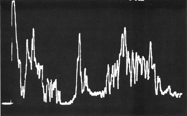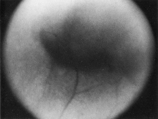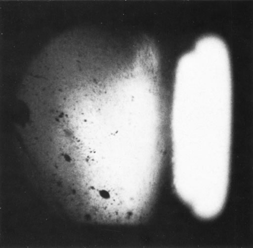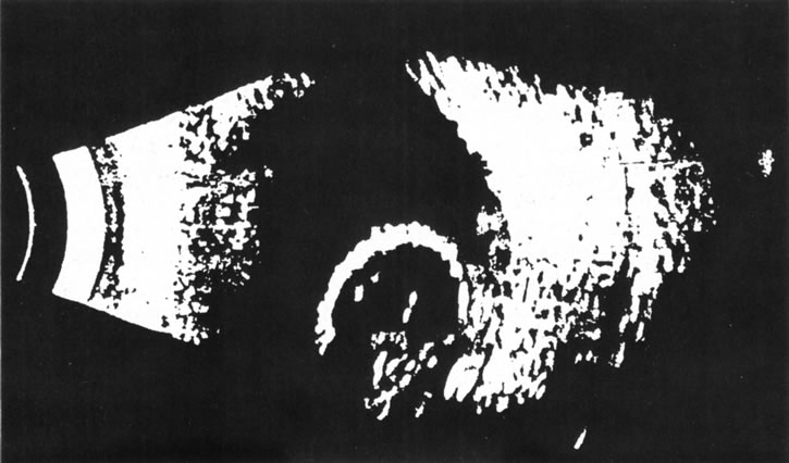 Unfortunately, imaging studies are not always diagnostic. The A- and B-scans shown in Figures 3 and 4 were from a patient with unilateral media opacity referred for evaluation and treatment of a presumed uveal melanoma. Occasionally, if the cataractous lens is scanned tangentially, artifact can occur. A repeat ultrasound at our institution was negative for tumor, and the referral ophthalmologist who performed a cataract extraction noted that no tumor was present and that the patient has an excellent visual outcome. In contrast, the patient shown in Figure 5 was referred with a presumed uveal melanoma with secondary inflammation and a history similar to that described for the patient shown in Figure 111 Ultrasound and CT examinations were not diagnostic. Because the eye was blind and painful, it was enucleated, and an extremely necrotic uveal melanoma was noted histologically. In some necrotic melanomas, the fundus cannot be visualized and the diagnosis cannot be established with imaging studies. Very rarely, a necrotic uveal melanoma can produce sufficient pigment dispersion into the vitreous to obscure the correct diagnosis.12
