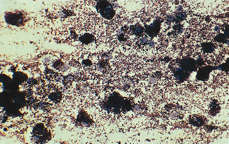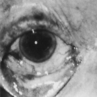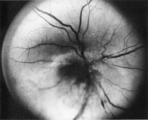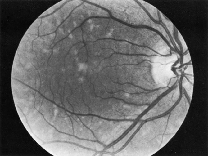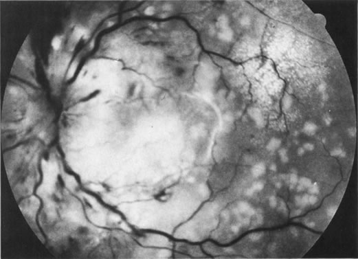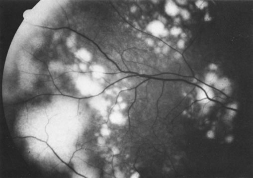 A number of retinal lesions can either produce or simulate uveitis. Retinal detachments can occasionally produce enough inflammation for anterior uveitis to obscure both fundus detail and the correct diagnosis. In a patient with markedly decreased vision and media opacification, an ultrasonographic evaluation is mandatory to rule out a neoplastic or foreign body process. Cases of inapparent retinal detachment also can be correctly diagnosed with ultrasonography. Uncommonly in central serous choroidopathy, protein deposition at the leakage point can simulate a focal choroiditis. Medullated nerve fibers can simulate retinochoroiditis, but the shape, corresponding to the nerve fiber layer with the absence of other signs of inflammation, usually allows a clear-cut differentiation.53 Some retinal dystrophies and degenerative processes can simulate a retinochoroiditis. Vitreous cells may occur in cases of retinitis pigmentosa. Pigmented paravenous retinochoroidal atrophy has a distinctive pattern of pigmentary deposits surrounding retinal veins; it may occur as an idiopathic degenerative disorder or sometimes as a sequela of ocular sarcoid. Fundus flavimaculatus is a rare autosomal recessive dystrophy that is usually detected in the third decade of life. It produces typical comma-shaped, yellowish retinal pigment epithelial opacities in the posterior pole, but it does not involve the macula. It can simulate a diffuse choroiditis (Fig. 24). Myopic degeneration can produce small, white, posterior pole spots that can simulate a posterior choroiditis. Peripheral fundus “paving stone” degeneration is rarely confused with an inflammatory process. These lesions show no evidence of retinal or vitreal inflammation and are quite common.54