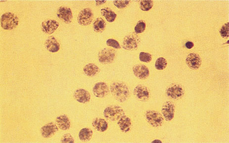 Most commonly, pseudohypopyons in adults develop in association with either a systemic lymphoma or leukemic relapse. Rarely, metastatic cutaneous melanoma can produce this pattern; however, usually these later cells are pigmented (Fig. 15). Much more frequently, vitreous cells in patients with known metastases are benign, originating from either infectious or endogenous uveitis. A masquerade syndrome secondary to a distant malignancy can take several forms. In some metastatic tumor patients, multiple areas of increased choroidal pigmentation develop. Although these paraneoplastic syndromes are rare, a more common form is autoimmune destruction of retinal photoreceptor or ganglion on cells that more commonly occur either with small cell carcinomas of the lung or metastatic cutaneous melanoma.19–23 The evaluation of patients with metastatic tumors to the eye may be difficult. Approximately 10% of uveal melanoma patients have a history of a systemic malignancy. Approximately 50% of patients with uveal metastases are found to have an elevated plasma carcinoembryonic antigen or cancer antigen 125 level; in contrast, uveal melanoma patients do not have significantly elevated levels.24 Most metastases to the uveal tract can be correctly diagnosed with ultrasonography. In atypical presentations of metastatic tumors in which there is diagnostic uncertainty, we have confirmed the diagnosis with an intraocular FNAB.18 In several ocular oncology units, FNAB has become an important diagnostic adjuvant in difficult cases.25–27 We use FNAB in intraocular oncologic cases that cannot be diagnosed with noninvasive techniques.4 We have observed no false-positives in uveal melanoma diagnosis, and in that malignancy, we can accurately predict prognosis on the basis of the cellular composition (percentage of epithelioid cells) of the aspirate.27 Rarely in a necrotic melanoma, insufficient viable tumor cells are present to establish a diagnosis with this technique. In several lesions that simulate either retinoblastoma or melanoma, cytologic pattern on FNAB is diagnostic. We have found this technique especially useful in atypical metastatic uveal tumors. Often such patients are incorrectly diagnosed as having either a uveal melanoma or a benign lesion. Establishing the correct diagnosis results in optimum treatment. A misdiagnosis of a uveal melanoma would require a subsequently higher radiation dose with a higher likelihood of radiation vasculopathy. Conversely, a misdiagnosis of a benign process would result in ineffective therapy. Figure 16 shows a case of what clinically and ultrasonographically appeared to be a uveal melanoma. The FNAB specimen revealed a cellular pattern that was diagnostic of a primary carcinoid (Fig. 17), and the patient responded dramatically with 40 gray of photon radiation. Figure 18 shows the FNAB cytopathology of a typical epithelioid choroidal melanoma; in contrast, a smear of a spindle cell tumor has spindle-shaped cytoplasm and smaller nuclei. Figure 19 shows a benign pigmented mass, such as a retinal pigment epithelial proliferation or a melanocytoma. In contrast to a melanoma, this type of mass has much larger pigment granules and benign cytomorphologic detail. In addition to standard cytopathologic FNAB evaluation, aspirated material may be used for several molecular biology studies (e.g., fluorescence in situ hybridization, comparative genomic hybridization), flow cytometry, special stains, tissue culture, and ultrastructural analyses.