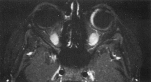 The role of MRI in the evaluation of intraocular masquerade syndromes is unclear. There was initial enthusiasm about the possibility of differentiating atypical uveal melanomas from hemorrhagic-simulating lesions based on the unique paramagnetic properties of melanin.13 In relation to vitreous, a uveal melanoma typically has a bright signal on a T1 image and a dark signal on a T2 image. In contrast, hemorrhagic processes tend to be either bright or dark on a T1 image and bright on a T2 image.14 Unfortunately, there are several problems with MRI for uveal melanoma diagnosis. First, several investigators have shown that unless high field-strength, thin-section scans with surface coils are used, the quality of data obtained is suboptimal.15 Second, even in a state-of-the-art center, we have had a number of cases in which we were unable to differentiate between a uveal melanoma and a simulating lesion on the basis of MRI data. We obtain MRI studies in older patients with opaque media, equivocal ultrasonographic data, and large masses. In some of these cases, the MRI is diagnostic of either a melanoma or an extramacular disciform (hemorrhagic) process. It is also a useful adjunctive study if localized extraocular extension is suspected. In equivocal cases, however, we proceed to using invasive diagnostic techniques, such as fine-needle aspiration biopsy (FNAB) (see Metastatic Tumors). In addition to producing media opacity, inflammation, and cataract, uveal melanomas can also produce other signs that may lead to the incorrect diagnosis of uveitis. Anterior melanomas, especially those that involve the ciliary body, often produce dilated episcleral vessels (sentinel vessels) that occasionally have been misdiagnosed as scleritis (Fig. 6).