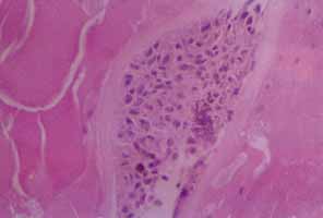 Pathologic Features The classic histopathologic description of phacoantigenic uveitis is zonal granulomatous inflammation centered on lens or lens material.126,138,139 Polymorphonuclear leukocytes make up the inner layer, surrounded by an intermediate mantle layer of epithelioid cells, macrophages, and giant cells. The outer layer contains variable amounts of fibrous connective tissue and collagen infiltrated by lymphocytes126,138,139,140 (Fig. 3).