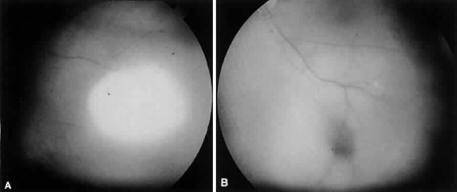 Primary corneal keratitis caused by M. tuberculosis varies in clinical appearance, and thus, diagnosis is difficult to make on clinical grounds.47 Secondary keratitis can result from direct spread from tuberculous scleritis or anterior segment infection.48 SCLERA AND EPISCLERA Episcleritis is the result of hypersensitivity reaction to tuberculoprotein. Duke-Elder49 described epibulbar disease to be either ulcerative, nodular, hypertrophic papillary, or polypoid. Deep nodular scleritis results from direct invasion of the sclera by the tubercle bacillus. Tuberculous scleritis usually elicits pain as a prominent feature, as is seen typically in scleritis associated with autoimmune diseases. Clinically, the scleritis consists of one or more indurated nodules that appear fixed to the sclera and are associated with marked injection. Eventually, the nodule turns yellow as it undergoes caseation, and eventually ulceration follows. Involvement of the adjacent ciliary body and iris can result in an associated granulomatous anterior uveitis. Scleral perforation may occur.50,51 The scleritis is refractory to treatment with topical corticosteroids, suggesting that the scleritis is the result of direct invasion of the tubercle bacillus and is not a hypersensitivity reaction.52 UVEITIS Tuberculosis once was considered a common cause of uveitis, but it currently is uncommon. Its incidence accounts for about 0.2% of all uveitis cases. Anterior uveitis usually is granulomatous and is characterized by mutton-fat keratic precipitates, Koeppe and Busacca nodules on the iris. Hypopyon can occur. Less commonly, the anterior uveitis can be nongranulomatous, with an acute, recurrent, or chronic course. Topical corticosteroids may convert an anterior granulomatous uveitis to a nongranulomatous form.53 Conglomerate tubercles of the iris resulting from coalescing of miliary tubercles of the iris rarely are seen but have been reported.54 The possibility of TB should be entertained for any steroid nonresponsive uveitis. The choroid has a particular propensity for involvement by TB. Choroidal granulomas can be solitary or—as in miliary TB—multiple, causing a disseminated choroiditis. Choroidal granulomas are yellowish-white nodules with indistinct borders, ranging in diameter size from 0.5 mm to 2 cm. They may be seen in patients without active systemic disease (Figs. 4 and 5). Although A-scan findings are variable, B-scan typically reveals a solid elevated choroidal mass with an absent scleral echo due to absorption by inflammatory cells.55 Fluorescein angiography generally shows early hyperfluorescence with leakage at the margins and late central leakage. After treatment, there may be loss of early hyperfluorescence and late staining. Choroidal neovascularization can occur.55–57 Endobiopsy has been performed safely for diagnosis.58