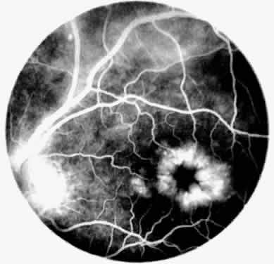 petaloid hyperfluorescence in the late phases of the angiogram.