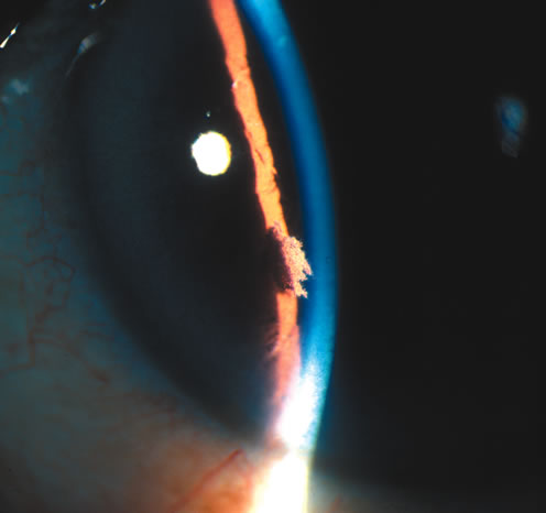 IRIDOSCHISIS Clinical Features Iridoschisis is a rare condition that involves the iris stroma. The term iridoschisis is used when there is a split causing a cleft to occur in the iris stroma. The iris pigment epithelium and dilator muscle posteriorly are unremarkable. Histopathology including transmission electron microscopy shows marked atrophy of the iris stroma with separation of its anterior and posterior layer. The iris vasculature appears unremarkable.6,7 Iridoschisis mainly occurs in elderly8–10 but isolated cases have been reported in young patients after concussive injury.11 It has also been reported to occur as a familial condition,12 has been associated with microphthalmos,13,14 interstitial keratitis,14,15 use of miotics,8 keratoconus,16 and lens subluxation.17 Slit-lamp examination reveals iris stromal fibers and blood vessels that remain attached to one portion of the iris with the loose ends floating freely in the anterior chamber, producing the so-called shredded-wheat appearance. The location of iridoschisis is often inferior (Fig. 3).