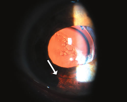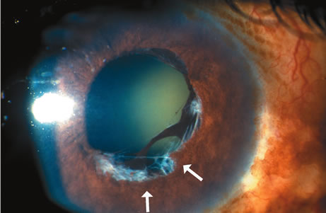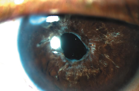 The iris atrophy that follows trauma resembles that which occurs after inflammation, although distortion of the pupil is more common as a results of sphincter tears (Figure 6B). SURGICAL One of the more common reasons for focal iris atrophy in recent years is found in eyes that have undergone extracapsular cataract extraction with placement of an intraocular lens implant.45,47 This is an erosion phenomenon that occurs with anterior chamber lens and sulcus fixated lens (Fig. 7).48,49 Iris atrophy is also seen commonly around surgical or laser iridectomies.