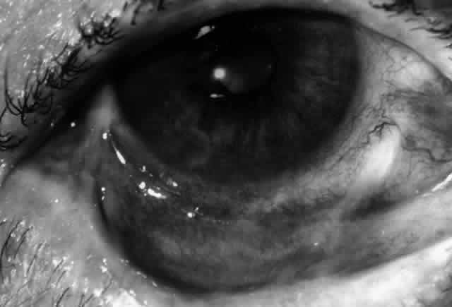 Epidemiology SJS, although it has no racial or geographic predilection, occurs in young males more commonly than in other groups of individuals, with winter and spring seasonal peaks.67 The disease is relatively common, accounting for up to 1% of dermatologic outpatient visits.68,69 Pathogenesis Histologically, the skin lesions exhibit diffuse inflammatory infiltration and edema of the dermis. When bullae are present, they are subepidermal in location and without acantholysis.66 The exact pathogenetic mechanism of this disease is unknown; autoimmune, infective, and allergic factors have all been considered possible causes. Most evidence now favors a hypersensitivity to microbes and drugs.70 Erythema multiforme has been associated with various bacterial (especially Mycoplasma pneumoniae), viral (especially herpes simplex virus), mycotic, and protozoan infections, with drugs and vaccines, with allergic contactants, with collagen disorders, and with internal malignancies. Some of the incriminated precipitating drugs include sulfonamides, tetracyclines, penicillin, bromides, iodides, salicylates, phenytoin sodium, barbiturates, phenylbutazone and other nonsteroidal antiinflammatory drugs, cortisone, and vaccines against polio, smallpox, influenza, diphtheria, and tetanus. The development of or exacerbation of Stevens-Johnson syndrome has been reported after ophthalmic application of proparacaine,71 sulfonamide,72 tropicamide,73 and scopolamine.73 Herpes simplex virus (HSV) is a vastly underappreciated cause of EM,74 with 15% to 63% of cases associated with this virus.75,76 Recurrent EM is especially associated with recurrent HSV infection,77 and herpes simplex virus has been isolated from the skin lesions of erythema multiforme.78 The results of our research,79 as well as that of others,80–87 suggest that episodic showers of circulating immune complexes may result in immune complex deposition in previously damaged, predisposed vessels, with resultant immune complex vasculitis/perivasculitis with lymphocyte and neutrophil participation in the vessel damage. Leakage of plasma and cells may progress to subepidermal blister formation and to necrosis of the epidermis over the blister.66 Diagnosis The diagnosis of SJS is not difficult, given the dramatic characteristic skin and mucous membrane lesions. Ocular Manifestations Ocular involvement is common in Stevens-Johnson syndrome, occurring in more than half of patients with this disease.70 The acute ocular manifestations vary from mild mucopurulent conjunctivitis to severe, pseudomembranous conjunctivitis leading to symblepharon, lid scarring, keratoconjunctivitis sicca, corneal ulceration, corneal scarring, and neovascularization. The chronic consequences of SJS depend on the degree of subepithelial fibrosis and tarsal conjunctival keratinization that occurs as a result of the acute exanthem. The former (fibrosis) results in variable degrees of meibomian duct and lacrimal ductule obstruction (with resultant deficient or unstable tear film problems), trichiasis, distichiasis (with resultant chronic abrasive trauma to the cornea), and cicatricial entropion; tarsal conjunctival keratinization results in a chronic sandpapering trauma effect on the cornea with each blink. The combined effects of these external aggravants produce chronic keratopathy, with eventual corneal scarring, neovascularization, or ulceration (Fig. 15). One other chronic, rare ocular manifestation of SJS may develop: recurrent, immunologically mediated conjunctivitis. Just as such recurrent episodes may occur in skin87 and in oral mucosa,88 so too may they occur in conjunctiva.79 The diagnosis of this phenomenon is not easy and depends on eradication of all external aggravants, eliminating these as confounding variables, and then demonstration, by immunohistochemical techniques employed on a biopsy specimen from the inflamed conjunctiva, of a lymphocytic microangiopathy with IgA deposition in the vessels. Herpes simplex virus is one inciting agent for recurrent SJS, and this possibility should be carefully investigated. Therapy Therapy of the acute phase of the ocular disease includes use of topical steroids as well as topical antibiotics applied frequently to combat superinfection, especially that from Staphylococcus aureus and (if the patient is hospitalized in a burn unit) Pseudomonas species. Lubricants should be generously employed, especially if lid involvement has resulted in even mild lagophthalmos. If anterior uveitis is present, mydriatic therapy is appropriate. Howard has pointed out that the pseudomembranes should not be stripped, because doing so leads to bleeding and increased scarring.89 Lid-globe adhesions should be lysed twice daily to maintain the fornices. I use my scleral depressor for this purpose after cleaning it with 70% isopropyl alcohol, having found no advantage to use of a glass rod. In an effort to prevent corneal scarring, Arstikaitis has advocated early tarsorrhaphy before deep stromal vessels invade the cornea.90 This is appropriate in instances of lagophthalmos and persistence of corneal epithelial defects. The chronic phase of ocular involvement in Stevens-Johnson syndrome necessitates caring for the consequences of the acute exanthem: punctal occlusion for sicca syndrome, electro- or cryoepilation for trichiasis, soft or scleral contact lens therapy for chronic keratopathy arising from residual trichiasis and from tarsal conjunctival keratinization, mucous membrane grafting, and corneal surgery for preservation of globe integrity and, in rare instances, for attempted visual rehabilitation.91 Recurrent SJS may respond to chronic systemic acyclovir therapy if herpes simplex virus is the agent provoking the attacks. Some cases of recurrent SJS not associated with herpes have responded to long-term systemic immunosuppressive chemotherapy.79 TOXIC EPIDERMAL NECROLYSIS Definition Toxic epidermal necrolysis (TEN) (Lyell's disease, Ritter's disease, 