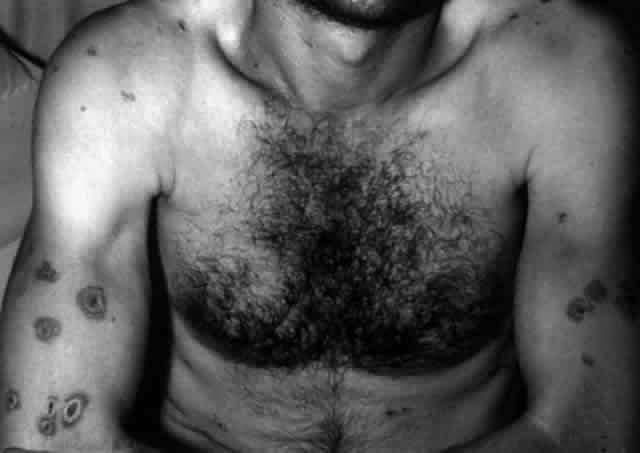 Ocular Manifestations Ocular manifestations of dermatitis herpetiformis are rare. Keratoconjunctivitis sicca, iritis, choroiditis, and papillitis have occurred in individual patients, but the causal relationship between dermatitis herpetiformis and the ocular problem is debatable. Treatment Dapsone revolutionized the care of patients with DH, with resolution of symptoms and new lesion development within 48 hours of initiation of therapy.64 The usual caveats regarding dapsone therapy vis-à-vis sulfa allergy and glucose-6-phosphate dehydrogenase deficiency must obviously be kept in mind. The dose of dapsone sufficient to induce remission, 100 to 300 mg per day, can usually be tapered to very low doses for maintenance of remission. Equally important, however, is the strict adherence to a gluten-free diet if one is to eliminate the dependence on medical therapy.65 ERYTHEMA MULTIFORME Definition Erythema multiforme (EM) is an acute inflammatory disease affecting primarily skin and mucous membranes.66 Major and minor variants exist, and it is the former, also known as Stevens-Johnson syndrome (SJS), that is of most concern to ophthalmologists.67 Prodromal symptoms of SJS include general malaise, myalgias, and fever.68 Skin lesions develop by 10 days to 4 weeks after the onset of the prodrome; they tend to be annular in shape (“iris lesions”) but may be maculopapular or bullous. Most commonly, involvement is limited to the skin of the dorsum of the hands and feet and the palms and soles. Later, the limbs, trunk, face, and neck may become involved (Fig. 14). EM major or SJS may be fatal, either from the systemic, visceral involvement of the disease or from complications arising from the extensive exfoliation of skin, producing consequences similar to those seen in patients with third-degree burns. The mortality rate is reported to be between 5% and 15% of cases, and 20% of cases recur.66