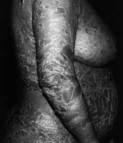 Lamellar ichthyosis in combination with mental retardation, short stature, and pyramidal tract spasticity describes Sjögren-Larsson syndrome. These patients may have hypertelorism, dental osseous dysplasias, and epiphyseal-metaphyseal dysplasia. They may also suffer spastic diplegia or quadriplegia and may be subject to focal motor seizures. Their life expectancy is less than half that of the normal population. In 20% to 30% of these patients, chorioretinitis with macular and perimacular pigmentary degeneration develops.177 These changes were described by Gilbert and associates in a 2<fr1/2>-year-old black male.178 The lesions were sharply circumscribed, involved the macula, were tan-white, were approximately <fr1/2> disc diameter, and were surrounded by small, glistening intraretinal dots. Fluorescein angiography demonstrated retinal pigment epithelial loss. The electroretinogram was normal. These authors noted that such lesions appeared similar to the late stage of vitelliform macular degeneration. Romanes has reported a case of severe keratitis with stromal scarring, vascularization, and descemetocele formation in a 24-year-old man with Sjögren-Larsson syndrome.179 However, this patient had autosomal recessive ichthyosis, and there is evidence to suggest that the corneal changes were due in part to the patient's rubbing of his eyes over a long period of time. Treatment Skin hydration and protection against skin moisture evaporation, keratolysis with 3% to 6% salicylic acid ointments or 60% propylene glycol, and, for short-term therapy, systemic methotrexate and/or etretinate are the therapeutic strategies most commonly employed. Epidermolytic hyperkeratosis is the most resistant to effective treatment. Topical sodium bicarbonate and topical antibacterial agents may help with the surface bacterial overgrowth and unpleasant odor so typically present. PSORIASIS Definition Psoriasis is a chronic papulosquamous disorder of the skin characterized by sharply demarcated, round, erythematous patches that eventually are covered by gray or silver-white scales (Fig. 24). Scalp, extensor surfaces of the limbs, knees, and elbows, and the sacral region are typically affected, producing symptoms of itching and burning. Changes may also occur in the nails.