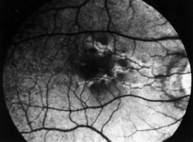 Epidemiology PXE affects women twice as often as men. Pope's type I dominantly inherited form is characterized by choroiditis, peau d'orange skin, hypertension, and angina, whereas Pope's type II dominant form is characterized by myopia, blue sclera, joint hypermobility, and hyperelastic skin; this latter form is four times more common than type I. Classic PXE (Pope's recessive type I) is the more common form. Pathogenesis Histologically, there is calcium deposition in the dermal elastic fibers in this condition. This change is characteristically seen with degeneration of the elastic fibers, and the relative amount of dermal hyaluronic acid is increased. Similar changes occur in the heart, the blood vessels, and the elastic lamina of Bruch's membrane. The pathophysiology in this disorder is not clearly understood. Increased immunoglobulin levels have been reported in the sera of patients with PXE.201 Huang and colleagues have concluded, on the basis of their electron microscopic studies, that the disease is due to abnormal formation of the elastic fibers rather than to degeneration.202 Diagnosis The diagnosis of PXE is based on the clinical picture and the characteristic features on histopathology of the skin. Ocular Manifestations Pseudoxanthoma elasticum is complicated by the formation of angioid streaks in the fundi of approximately 85% of patients, and this form of the disease is known as the Grönblad-Strandberg syndrome. It is complicated by disciform macular degeneration and subsequent loss of central vision in 70% of patients so affected.203,204 Angioid streaks usually occur bilaterally and develop in the second or third decades of life, gradually becoming wider over several years (Fig. 30).204,205 They are rarely seen in children. Diffuse mottling, often associated with widespread drusen-like spots, may be the earliest fundus change in this disease. Frequently, these drusen may have a rocklike atypical appearance, and 6% of PXE patients may have associated optic nerve drusen.206 These disturbances may be present without any evidence of angioid streaks. Gills and Paton have described a family in which two brothers were affected. The mother, a carrier, had the mottled fundus but no skin manifestations. One brother had mottling and angioid streaks, whereas the second brother had mottling only. Streaks later developed in the second brother after trauma to one of his eyes.207