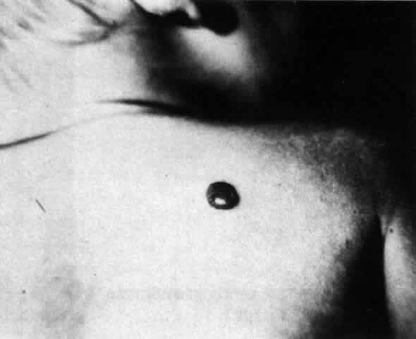 Ectodermal dysplasia, in conjunction with ectrodactyly and cleft lip and palate, has been reported as a syndrome.235,240 These patients exhibit photophobia, chronic blepharitis, entropion, lacrimal system anomalies, and corneal scarring. Reported systemic anomalies have included congenital absence of one kidney, deformities of the external ear, hypoplastic nipples, and multiple small cutaneous melanomas.240 Corneal changes associated with ectodermal dysplasia have been attributed, in some cases, to deficient lacrimation.238 However, Baum and Bull believe that the corneal disease is due to an inherent epithelial defect. Their patient exhibited diffuse stromal opacification in the upper third of both corneas, beginning as superficial stromal infiltration and later becoming more diffuse, opaque, and vascularized. A keratoplasty was performed, but the graft became opacified when it failed to re-epithelialize. The authors suggest that this failure to re-epithelialize was due to the basic ectodermal defect in the host epithelium.235 Treatment There is no known effective treatment for this disorder. MALIGNANT ATROPHIC PAPULOSIS Definition Malignant atrophic papulosis, or Degos' syndrome, is a rare endovasculitis that affects the skin, intestine, eye, and other organs. It is usually a rapidly fatal disease affecting primarily young and middle-aged men.241,242 Clinically, these patients develop disseminated papular lesions of the skin over the front of the trunk and proximal parts and flexor surfaces of the extremities. Eyelids, hands, and oral mucosa may also be involved.241 Presenting as pink-to-red round or oval papules 2 to 10 mm in diameter, these lesions progress to form porcelain-white atrophic central depressions that are often surrounded by telangiectasia (Fig. 36).241