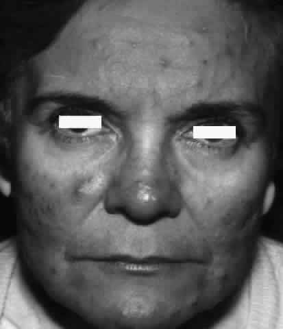 BASAL CELL NEVUS SYNDROME Definition Basal cell nevus syndrome is an inherited disorder in which multiple basal cell epitheliomas develop on the skin of the eyelids, nose, cheeks, and forehead, and, less frequently, on the trunk, on the neck, and in the axilla. These may be flesh-colored or pigmented papules or nodules, and they may be associated with fine telangiectasias (Fig. 31). These tumors may not become invasive for many years. Other cutaneous lesions, including lipomas, fibromas, and epithelial cysts, may be seen. The tumors may be congenital, although they usually appear in childhood or adolescence. An autosomal dominant pattern of inheritance has been demonstrated in families with this disease.210