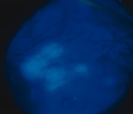 In primary ocular HSV infections, a severe follicular conjunctivitis with regional adenopathy is present. Vesicles may appear on the eyelid skin or lid margin, producing blepharitis (Fig. 3). Corneal involvement initially takes the form of a superficial punctate keratitis, which may progress to dendritic or geographic ulceration. Stromal infiltrates and uveitis are less common and relatively mild in primary disease. In uncomplicated cases, lesions usually heal completely in 2 to 3 weeks without scarring. Most cases of ocular HSV are recurrences. Recrudescent ocular herpes may take the form of dendritic or geographic ulcers, recurrent erosions, interstitial or disciform stromal keratitis, and anterior uveitis.3 HSV may also be an agent of retinitis and acute retinal necrosis (Fig. 4).