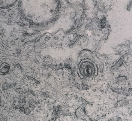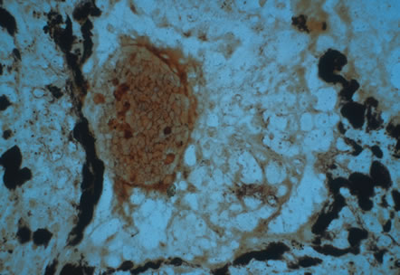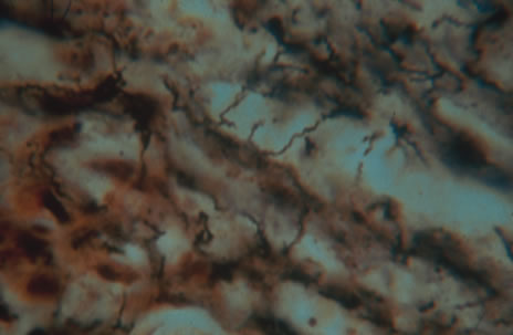 Histologically, lymph nodes contain nonspecific reactive hyperplasia with granuloma formation and occasional central necrosis. B. henselae organisms may be demonstrated in involved lymph nodes using the Warthin-Starry silver stain or electron microscopy (Fig. 23). The diagnosis can be made clinically in the majority of patients who have regional adenopathy, an identifiable inoculation site, and exposure to cats. Diagnosis is best supported by the presence of high anti-B. henslae serum antibody titers. Pyogenic infections, atypical mycobacterial infection, tularemia, early Hodgkin' s disease, and early tuberculosis can produce a similar clinical picture. Biopsy of enlarged lymph nodes should be reserved for cases in which the diagnosis is in doubt and delay might hinder the treatment of malignancy.