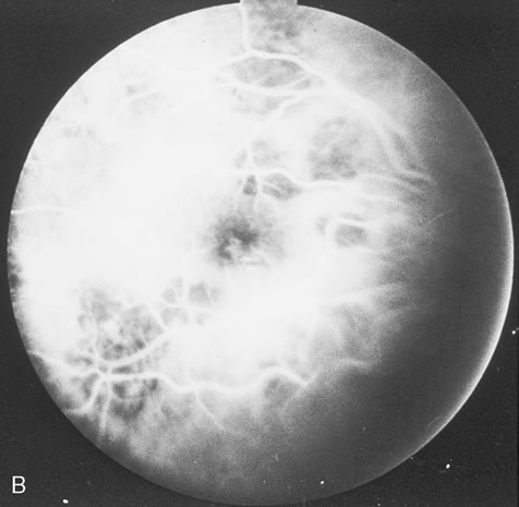 Diagnosis of varicella is usually not difficult, given the frequently obtainable history of exposure to a preexisting case and the characteristic rash. Serologic confirmation can be obtained by demonstrating increasing anti-VZV antibody titers. Multinucleated giant cells and eosinophilic intranuclear inclusions can be demonstrated by Papanicolaou's or other stains of smears from acute skin lesions. The clinical diagnosis of herpes zoster can be made in the presence of the characteristic vesicular lesions in a dermatomal distribution. Scrapings of the lesions demonstrate giant cells and intracellular inclusions. It is important to note that although most patients with herpes zoster are otherwise healthy, the possibility of an underlying systemic illness should be considered if the patient is young (i.e., younger than 50 years old) or the history suggests other systemic problems. The treatment of varicella is primarily supportive, consisting of analgesia, antipyretics, antipruritics, and good skin hygiene to prevent secondary infection. The use of aspirin in children is to be avoided in view of the belief that it may predispose to Reye's syndrome following varicella. Most eye disease is mild and self-limited and does not require treatment. Oral acyclovir (Zovirax) given five times daily early in the course of zoster infection has been shown to reduce the duration of viral shedding and the severity of acute pain. The greatest benefit is seen when medication is begun within 72 hours of onset of skin lesions. Two newer antiviral agents available for the treatment of herpes zoster are valacyclovir (Valtrex) and famcyclovir (Famvir). These agents have the advantage of a simpler dosing regimen, three times daily rather than five times daily with acyclovir, and a more favorable pharmacokinetic profile.13 It is thought that famcyclovir may also help speed resolution of postherpetic neuralgia. Valacyclvoir and famcyclovir are now preferred to acyclovir as first-line therapy for the treatment of zoster. They are well-tolerated drugs with few systemic side effects other than a requirement for reduced dosing in patients with renal failure. Oral corticosteroids also seem to have a beneficial effect in reducing acute pain and speeding cutaneous healing. They have not been shown to have an effect on postherpetic neuralgia. Topical corticosteroids and cycloplegics are commonly used to treat the inflammation associated with herpes zoster ophthalmicus.10 Tear supplements, bandage contact lenses, surgical correction of lid abnormalities, and tarsorrhaphy may be necessary to promote the healing of epithelial defects. Vision-threatening pathologic processes such as chorioretinitis and optic neuritis should be treated aggressively with intravenous acyclovir and high doses of prednisone. Treatment of postherpetic neuralgia is often disappointing. Routine analgesic drugs are generally ineffective. Cimetidine, colchicine, phenothiazines, and tricyclic antidepressants have been used with some success. Capsaicin cream and lidocaine patches may also be applied for local relief. The pain tends to slowly diminish and disappear over the course of 1 to 2 years but may be prolonged, especially in elderly patients. For those with severe intractable pain, intrathecal injection of methylprednisolone acetate once weekly for 4 weeks has recently been shown to provide relief.14 CYTOMEGALOVIRUS INFECTION Cytomegalovirus (CMV) is a herpes virus responsible for severe congenital malformations, a mononucleosis syndrome in young adults, and disseminated lesions in the immunosuppressed, especially retinal infection and pneumonia in patients with acquired immunodeficiency syndrome (AIDS). Patients with AIDS with CD4 counts between 50 to 100 cells per microliter are particularly susceptible to CMV retinitis. If the retinitis is untreated the prognosis is very poor often resulting in full-thickness retinal necrosis and blindness. Despite treatment, CMV retinitis often recurs in up to 50% of cases.15 In the United States, 20% of people are seropositive for CMV by age 20. Approximately 1% of infections are congenital and 5% perinatal. Anti-CMV immunoglobulin (Ig) G is present in greater frequency in homosexual men, on the order of 80% to 90%. The virus may be transmitted via blood, cervical secretions, semen, and breast milk and as an intrauterine infection. Serologic testing for CMV is not routinely performed because of this frequent exposure in the general population. Approximately 10% of congenitally infected newborns have permanent sequelae. The full syndrome is manifest as hepatosplenomegaly with hepatitis and cirrhosis, maculopapular rash, purpura, hemolytic anemia, pneumonia, microcephaly, microgyria, encephalitis, chorioretinitis, pathologic bone fractures, and growth retardation. Otherwise asymptomatic children may develop late sensorineural hearing loss or mental retardation. In normal older children and adults, the most common manifestation is an atypical mononucleosis, comprising fever and lymphocytosis with atypical lymphocytes. Lymphadenopathy and pharyngitis may be present, and rubelliform rashes occur. Heterophil antibodies are negative. In the immunocompromised, especially organ transplant recipients and patients with AIDS, CMV commonly is responsible for serious clinical syndromes. It causes an interstitial pneumonia, resulting in dyspnea and dry cough, with interstitial infiltrates on the roentgenogram. Subacute encephalitis, enterocolitis, adrenalitis, and adrenal necrosis may be noted. CMV retinitis is common in patients with AIDS. Perivascular granular white or yellowish infiltrates with hemorrhage are typical (Fig. 7). Minimal vitritis or anterior uveitis may be present. The posterior pole, including optic nerve, or peripheral retina may be involved. Optic neuritis may be retrobulbar. Resolution of retinal lesions reveals local retinal atrophy and pigment dispersion. Iridocyclitis may occur secondary to infection of