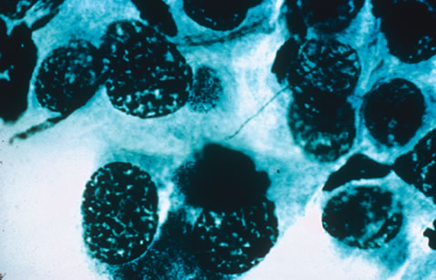CHLAMYDIA TRACHOMATIS INFECTION Chlamydiae are gram-negative intracellular parasites dependent on host cells for energy-related molecules. Chlamydia trachomatis infection is the most common sexually transmitted disease in industrialized countries and the most common cause of eye infection worldwide. It is also an important cause of infant pneumonia and may be related to Reiter's syndrome. Nongonococcal urethritis (NGU) is the most common manifestation of genital C. trachomatis infection in males, characterized by mucoid or mucopurulent discharge, dysuria, and pruritus. Urethral infection is often mild and may be asymptomatic. Twenty percent of male cases of gonococcal urethritis have simultaneous chlamydial infection. Postgonococcal urethritis due to chlamydia may develop 2 to 3 days after successful treatment of gonorrhea. Chlamydia proctitis is not uncommon in male homosexuals. Epididymitis and Reiter's disease may be complications. Cervicitis is the most common genital manifestation in female patients. Most women are asymptomatic. Mucopurulent discharge occurs in 40%. Chlamydia infections cause one third of cases of acute salpingitis (pelvic inflammatory disease), often with only mild symptoms of abdominal pain and only 5% positive cervical smears. Four to 21% of pregnant women may have C. trachomatis infection of the cervical canal, thus exposing the newborn at birth. Inclusion conjunctivitis may occur after an incubation period of 6 to 19 days. Thirty to 40% of pneumonias in the early months of life are because of Chlamydia, and approximately half of such children also have conjunctivitis.57 Lymphogranuloma venereum (Nicolas-Favre disease) is a sexually transmitted infection of C. trachomatis serotypes L1, L2, and L3, which are more invasive strains causing disease primarily in lymphatic tissue and rarely associated with Parinaud's oculoglandular syndrome. The primary lesions of lymphogranuloma venereum is a small painless papule, vesicle, or ulcer of the penis or vulvar or anorectal areas occurring 1 to 6 weeks after intercourse. Painful massive regional lymphadenopathy becomes suppurative, and draining fistulas develop within weeks of the primary lesion. Elephantiasis occurs as lymphatic vessels are obstructed. Trachoma is a chronic infectious keratoconjunctivitis caused by C. trachomatis serotypes A, B, and C. It affects approximately 400 million persons, mainly in parts of developing Africa, the Middle East, and Asia, but also may be seen in natives of the American Southwest. Trachoma may present as an acute conjunctivitis, but classic findings include conjunctival follicles, tarsal scarring and Herbert's pits.59 C. trachomatis serotypes D through K are the most common cause of infectious neonatal conjunctivitis in the United States and the cause of adult inclusion conjunctivitis as well as nonlymphogranuloma venereum genital infections. Adult and neonatal inclusion conjunctivitis and trachoma are reviewed elsewhere in these volumes. Gram's stain does not detect chlamydia. Tissue culture techniques are most sensitive. These cultures require special transport medium and refrigeration of the specimen and 48 to 72 hours of incubation with the cell culture prior to specific immunofluorescence staining for diagnosis. The McCoy cell culture using fluorescent antibody test for staining has become the gold standard.57 Direct Giemsa stained smears have a relatively low yield, with sensitivity varying from 50% to 90%, demonstrating dark blue or purple intracytoplasmic inclusions in a field of polymorphonuclear leukocytes, lymphocytes, and other cell types (Fig. 15). The microimmunofluorescent antibody stain for smears has approximately 90% sensitivity and 100% specificity compared to cultures. Serum antichlamydial IgM may aid diagnosis in neonatal pneumonia, and high titers of antichlamydial IgG may be found in complications of genital infection such as acute salpingitis. In addition to the McCoy cell culture, polymerase chain reaction may also aid in detection of C. trachomatis DNA.