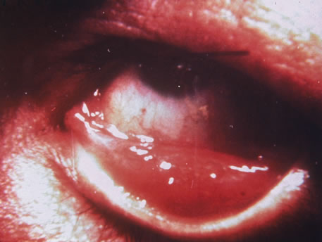 Congenital HSV infection is recognized at birth by jaundice, hepatosplenomegaly, central nervous system abnormalities, bleeding diatheses, microcephaly, seizure disorders, fever, chorioretinitis, and skin vesicles. It must be differentiated from similar syndromes caused by rubella, toxoplasmosis, and cytomegalovirus. Neonatal infection may be acquired in passing through the infected birth canal or by retrograde spread of the infection into the uterine cavity. Less common presentations of HSV infection include primary infections of the skin of the fingers (whitlows). These are caused by HSV type 1 in medical and dental personnel exposed to oral secretions. In the general community this lesion is caused by HSV type 2 infection. HSV type 1 may also cause a skin infection that mimics herpes zoster, although the dermatomal distribution is not usually maintained and the pain is less severe. On rare occasions, herpes simplex can cause a necrotizing hemorrhagic encephalitis of the temporal lobes marked by rapid deterioration to coma and death. Reactivation of HSV may be precipitated by fever, trauma, menstruation, emotional stress, or systemic illness. Recurrent episodes of HSV type 1 and type 2 are generally preceded by several hours of burning, itching, and tingling before the skin vesicles appear. Systemic symptoms tend to be mild or absent, with the exception of recurrent adenopathy. The lesions appear similar to the primary infection and are frequently painful. The most frequent regional recurrences of HSV type 1 are on the vermilion border of the outer lip (herpes labialis) and in the eye (Fig. 2). Recurrences of HSV type 2 characteristically produce lesions on the penile shaft and glans in the male and on the labia and perineum in the female. Headache and aseptic meningitis are occasionally associated with a genital recurrence. Further recurrences may be seen at monthly or yearly intervals.