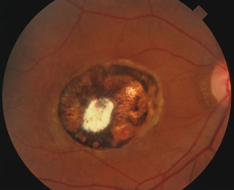 Diagnosis is made histopathologically through demonstration of large septate branching hyphae. Blood cultures are of limited value because they have characteristically low yield. In cases of fungal endophthalmitis vitrectomy is both diagnostic and therapeutic. Vitrectomy is accompanied by intravitreal injection of amphotericin B as well as intravenous administration. Amphotericin B is also thought to be synergisitic with flucytosine or rifampin. In cases of orbital aspergillosis surgical debulking is crucial to treatment. Visual prognosis is typically poor and overall mortality rates are high in those with invasive aspergillosis. HISTOPLASMOSIS Histoplasma capsulatum causes a spectrum of disease ranging from skin test positivity to rapidly fatal pulmonary or disseminated infection. Histoplasmin skin test surveys indicate that the Ohio and Mississippi River Valleys of the central United States are endemic regions. Inhalation of spores causes infection. Most infected persons are asymptomatic. Typical illness involves abrupt onset of fever, chills, cough, chest discomfort, headache, arthralgias, and myalgias. Erythema nodosum and erythema multiforme may accompany arthralgias. Healed pulmonary lesions usually resolve completely. Calcified granulomas may later be seen in lung parenchyma, hilar and mediastinal lymph nodes, and spleen. More than 90% of normal hosts recover uneventfully.121 Chronic pulmonary infection is more likely seen in male smokers over age 40 and resembles chronic pulmonary tuberculosis, with progressive cough, weight loss, and apical infiltrates with cavitation and retraction seen on the chest roentgenogram. Progressive disseminated histoplasmosis occurs more often in young children and patients with AIDS. In acute stages, these patients have high fever, hepatosplenomegaly, variable lung findings, and pancytopenia. Mucosal ulcers, granulomatous hepatitis, Addison's disease, endocarditis, aortic aneurysms, intracranial mass lesions, and chronic meningitis have been described. The presumed ocular histoplasmosis syndrome comprises chorioretinal “punched-out” lesions in the posterior pole and mid-periphery, peripapillary scarring, and disciform maculopathy, with or without choroidal neovascularization (Fig. 30). The vitreous is clear. Bilateral disease occurs in 50%, and bilateral maculopathy is noted in 20% to 30%. A dreaded sequelae is the development of subfoveal choroidal neovascularization. Histoplasmin skin testing is positive in 95%, and prevalence of eye disease is greater in areas of endemic histoplasmosis.121