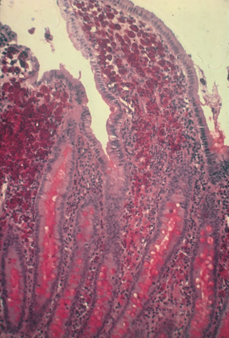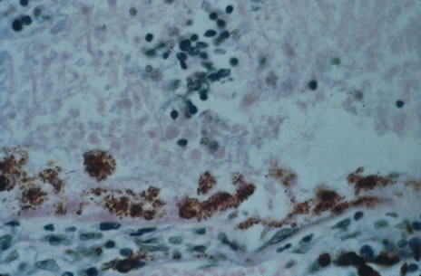Jejunal mucosal biopsy is the usual means of diagnosis, but all involved organ systems may demonstrate the periodic acid-Schiff-positive granules, including the vitreous and cerebrospinal fluid. Polymerase chain reaction may be used to detect the rRNA of Tropheryma whippelli in the cases of extraintestinal biopsy. Antibiotic therapy will usually induce clinical remission in this formerly fatal disease. Penicillin plus streptomycin, tetracycline, and chloramphenicol regimens have been reported. The preferred treatment regimen is currently with two weeks of intravenous therapy of trimethoprim-sulfamethoxazole, followed by a 1-year 960-mg, twice daily oral regimen of the same medication. The disease may be followed with serial jejunal biopsies. The number of macrophages and bacilli-like structures decreases with antibiotic treatment. |