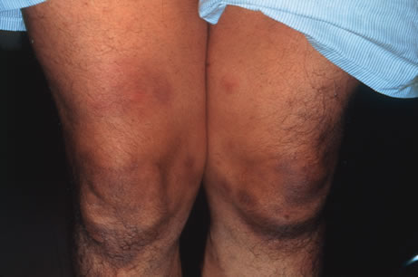 REITER'S SYNDROME Reiter's syndrome is classically described as the triad of arthritis, urethritis, and conjunctivitis, although broader definitions have been proposed. It may occur as a reactive arthritis following gram-negative dysenteries or nongonococcal urethritis. Chlamydia trachomatis and Ureaplasma urealyticum are the most commonly associated nongonococcal urethritis organisms. Enteric pathogens related to reactive arthritis include Shigella, Salmonella, and Brucella species, Yersinia enterocolitica, and Campylobacter jejuni.188 Reiter's syndrome occurs most commonly in men 20 to 30 years of age. Between 1% and 3% of patients with nongonococcal urethritis develop reactive arthritides, and 20% of those patients with HLA-B27 positive disease do so. Reiter's syndrome may follow 1.5% of cases of Shigella enterocolitis and 25% of HLA-B27–positive Shigella cases. Presenting signs and symptoms include, in order of frequency, polyarthritis, urethritis or cervicitis, back or heel pain, eye disease, stomatitis, keratoderma, and diarrhea. There is typically a latent interval from onset of urethritis or diarrhea to rheumatologic disease. The arthritis usually involves weight-bearing joints, especially the knees and ankles. Plantar fasciitis and achilles tendinitis is common. The arthritic manifestations may be acute and short lived but often are recurrent or chronic. Secondary ankylosing spondylitis is not uncommon. Keratoderma blennorrhagica begins as discrete vesicles that thicken and become hyperkeratotic nodules, histologically and clinically resembling psoriasis. Lesions occur most commonly on plantar surfaces, toes, and the glans penis. Mucocutaneous lesions are notably absent in primary ankylosing spondylitis. Cardiac arrhythmias and aortic valve disease may be evident. Conjunctivitis occurs in 30% to 60% of cases and is not usually chronic. Superficial keratitis with multifocal subepithelial and anterior stromal infiltrates has been described.189 Nongranulomatous anterior uveitis occurs in 3% to 12% of patients and may be severe and acute, recurrent, or chronic.190 Radiologic examination demonstrates various arthritic changes. Synovial fluid aspirates and synovial biopsy show a nonspecific mixed inflammatory reaction. The erythrocyte sedimentation rate may be elevated. Rheumatoid factor and antinuclear antibodies are negative. Smears of urethral discharge may be sent for immunofluorescent antichlamydial staining. Routine urine cultures will be negative. Stool cultures can be helpful for enteric pathogens. HLA-B27 antigen testing is not diagnostic but may be of interest. Nongonococcal urethritis and other infections can be treated specifically with antibiotics, but otherwise management is symptomatic. Physical therapy, nonsteroidal antiinflammatory drugs, and intralesional corticosteroids may be helpful for joint, tendon or fascial inflammation.188 Keratolytics or topical corticosteroids may improve cutaneous lesions, and topical corticosteroids are indicated for iritis. Many patients have chronic persistent or recurrent disease over many years, including arthritis, urethritis, uveitis, and skin lesions. SARCOIDOSIS Sarcoidosis is a chronic granulomatous disorder of unknown etiology involving virtually all organ systems. It is postulated that the etiology of sarcoidosis is an exaggerated immune reaction to an unknown antigen, a reaction which may be caused by an inherited or acquired deficiency of the immune system. In the United States, the disease is more common in middle-aged adult blacks. Outside of the United States, however Scandinavian and Irish people have a notably higher incidence of sarcoidosis. Blacks often present acutely with severe disease in contrast to whites who are more often asymptomatic. However, the final outcome of disease in terms of morbidity and mortality is similar.191 Most patients with sarcoidosis present with respiratory difficulties in addition to constitutional complaints of fever, weight loss and fatigue. Patients may also be asymptomatic and discovered based on incidental findings of hilar adenopathy on chest radiography performed for other reasons. The lungs are most frequently involved in sarcoidosis, followed by the lymph nodes, eyes and skin (Fig. 45A and 45B). Skin involvement consists of a nonspecific manifestation of erythema nodosum and lupus pernio which is specific for sarcoidosis (Fig. 46).