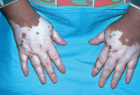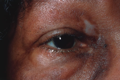 Treatment of Behçet's disease is with prednisone and other immunosuppressive agents, such as chlorambucil201 or cyclosporine. A combination of cyclosporine and prednisone has been found to be of greater benefit compared to prednisone alone.202 Treatment must often continue for a number of years and discontinuation of treatment is often associated with reactivation of disease. VOGT-KOYANAGI-HARADA SYNDROME The Vogt-Koyanagi-Harada (VKH) syndrome was described by Jonathan Hutchinson in 1892. The syndrome is associated with a prodrome of headache, stiff neck, pain, fever, nausea, and meningeal signs. If a spinal tap is performed at that time, lymphocytosis can be demonstrated in the cerebrospinal fluid. The prodrome is followed by an ophthalmic phase manifested by retinal edema, exudative retinal detachment and papilledema. The ophthalmic phase is followed by a convalescent phase, which is associated with perilimbal vitiligo followed by generalized vitiligo, alopecia, poliosis, and sensorineural hearing loss.203 In the United States the disease occurs commonly in blacks with American Indian ancestry, Native Americans, Hispanics, Eskimos, and Asian Americans. Patients with the full-blown syndrome may require a hearing aid because of sensorineural hearing loss, a wig because of alopecia, and make-up to cover the areas of vitiligo. Perilimbal vitiligo (Fig. 51) is the most constant sign and is seen in more than 90% of patients, whereas sensorineural hearing loss, skin vitiligo, alopecia, and poliosis are seen in approximately 25% to 40% of patients. Perilimbal vitiligo may also be associated with poliosis of the upper lid lashes. Symmetric skin vitiligo is typical of the VKH syndrome (Fig. 52). In disease such as thyrotoxicosis and diabetes mellitus, the vitiligo is also symmetric; whereas in conditions such as syphilis and leprosy the vitiligo is haphazard. In many patients the uveitis may be under control but the vitiligo of the skin progresses even with prednisone therapy (Fig. 53).