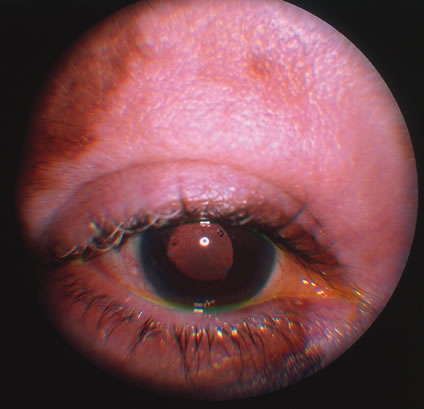 Eye disease is present in 25% to 50% of histologically proven cases of sarcoidosis.192 The most common manifestations are anterior granulomatous uveitis, followed by posterior uveitis and conjunctival nodules. Uveitis is a chronic problem in 50% of patients with sarcoid associated uveitis that is difficult to treat and may lead to significant reduction in vision (Fig. 47). Koeppe's nodules on the pupillary margin and Busacca's nodules on the iris stromal surface are nodules of inflammatory debris that are characteristic of, but not specific for sarcoidosis. Other ophthalmic manifestations include keratitis sicca, lacrimal gland enlargement, infiltrates surrounding retinal veins known as “candle-wax drippings,” chorioretinal granulomas, chorioretinitis, or most rarely orbital sarcoidosis involving pain, proptosis and limitation of motility.193 Two syndromes associated with sarcoidosis include Heerfordt's syndrome, which consists of fever, parotid swelling, uveitis, and occasionally facial palsy. Lofgren's syndrome is occasionally associated with anterior uveitis, but more frequently with erythema nodosum, arthritis, and hilar adenopathy.