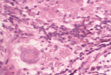 In the immunocompromised patient, other pathogens must be excluded, even in the presence of positive CMV cultures or serology. Tissue culture methods may take as long as 4 weeks. IgM antibody develops in primary infection and then disappears over 6 to 9 months, but it may reappear with reactivation of infection. The IgM test has unfortunately low specificity and sensitivity in infants and is less helpful than urine culture obtained at birth or in the first weeks of life. Any cell type may be infected, appearing larger than normal (cytomegalic) and demonstrating eosinophilic intranuclear “owl's eye” and smaller intracytoplasmic viral inclusion bodies, which are better seen with Giemsa or Papanicolaou's stains (Fig. 8). Histologic examination of tissue specimens, including bronchoalveolar lavage fluid and urine, may be useful for diagnosis.