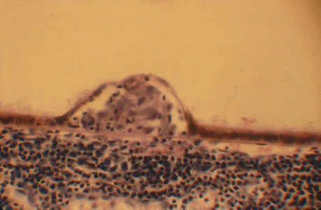 Treatment of VKH is with a combination of immunomodulating drugs, including high-dose prednisone, often in association with cyclosporine or chlorambucil. Early aggressive treatment with a gradual tapering of dosages is thought to result in an improved outcome.208 Corticosteroids are usually continued for the rest of the patient's life. Treatment has been shown to decrease capillary permeability and improve serous retinal detachments.209 SYMPATHETIC OPHTHALMIA Sympathetic ophthalmia (SO) is a cosmopolitan disease. It is rare, with fewer than 50 cases reported per year in the United States. Historically, in 1890, 5% of perforating injuries were associated with the development of sympathetic ophthalmia. As late as 1975, fewer than 0.1% of injuries led to the development of sympathetic ophthalmia. During the period from 1975 to 1980, 0.2% of enucleated eyes received in ocular pathology laboratories across the country showed sympathetic ophthalmia. Curiously during the 1967 Arab-Israeli War, no cases of SO were reported, although 10% of all casualties involved eye injuries. Sympathetic ophthalmia is an incurable disease. Once acquired, patients do not spontaneously go into remission from the disease. Rather, they go on to a life-long association with uveitis. More recently, aggressive treatment with a variety of immunosuppressive agents including corticosteroids and chlorambucil has been shown to be of benefit in improving final visual outcome.210 Regarding etiology, two types of injuries are associated with SO. The first is blunt perforating trauma, with an incidence of 0.44%. The second follows intraocular surgery such as vitrectomy,211,212 filtering surgery, and cataract extraction, accounting for an incidence of 0.06%. Onset of disease occurs in approximately 17% of cases within 1 month, 50% within 3 months, 65% within 6 months, and 90% within the first year. There are, however, reported cases that have occurred years to decades after the initial injury. Eight percent of cases in the literature occurred after enucleation of the exciting eye. HLA markers for susceptibility and severity of disease have been identified as HLA-DRB1 and HLA-DQA1.213,214 Signs of sympathetic ophthalmia are diminished visual acuity in 60% of patients, keratic precipitates in 30%, aqueous cells and flare in 50%, posterior synechiae in 15%, cells in Berger's space in 10%, vitreous cells in 25%, and macular or peripapillary edema in 20% of cases. In the sympathizing eye the earliest symptom is blurred vision occurring in 60% of patients and photophobia in 30% of patients. Blurred vision may be caused by a decreased amplitude of accommodation. This is an early sign of cyclitis. In the periphery of eyes with sympathetic ophthalmia, Dalen-Fuchs nodules may be present although they are not pathognomonic (Fig. 58). Dalen-Fuchs nodules are collections of lymphocytes beneath the retinal pigment epithelium and anterior to Bruch's membrane. The retinal pigment epithelium overlying the nodule is attenuated (Fig. 59). Immunopathologic studies have shown that the lymphocytes within the Dalen-Fuchs nodules are T-suppressor cells and cytotoxic T cells. Lymphokines, such as interleukin-2 and interferon-γ, and major histocompatibility (MHC) class II antigens can also be demonstrated.