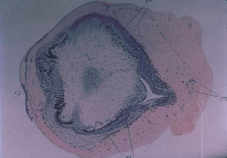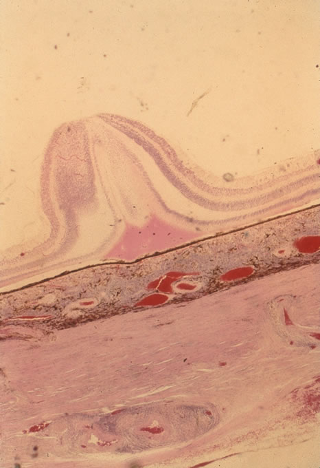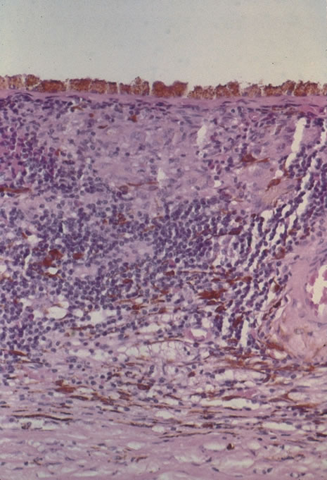 Histopathology of sympathetic ophthalmia shows granulomatous uveal inflammation with epithelioid cells, lymphocytes, multinucleated giant cells, eosinophils, and a few plasma cells. Generally there is sparing of the choriocapillaris. Epitheliod cells contain phagocytosed uveal pigment (Fig. 60). The granulomatous inflammation may extend into the scleral canal. Macular edema, with fluid accumulating in the outer plexiform layer as well as serous detachment of the sensory retina in the posterior pole can be observed (Fig. 61). Historically, 25% of cases of sympathetic ophthalmia have been associated with phacoanaphylactic endophthalmitis. In the injured eye one can see uveal prolapse, with a track of the wound to the limbus. There is extensive inflammation and Figure 62 is an artist's drawing from Fuchs' Atlas of Pathology showing panuveal inflammation; the pink areas represent epitheliod cells, whereas the dark zones are lymphocytic infiltration that has given rise to a marbleized appearance. Eosinophils may be readily seen among the lympocytes.