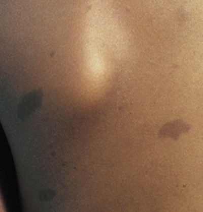 In young children, nearly half of sporadic cases fail to meet NIH criteria by 1 year of age, but meet them by age 8 to 12 years. The clinical features appear in the following order: café au lait spots, axillary freckling, Lisch nodules, neurofibromas.26 The inclusion of UBOs on MRI also aids the diagnosis of very young children25 but may require a general anesthetic. Genetics and Screening All family members of patients with NF1 should be screened. Lisch nodules are present in 90% or more of patients with the disease, so ophthalmic examination is essential. Annual ophthalmic examination with visual acuity, visual field, color vision, and fundoscopy is recommended for affected individuals. The NF1 gene (17q11.2) was cloned in 1990.76,77 Its protein, neurofibromin, is expressed throughout the body but particularly in the central and peripheral nervous system.12 It is a tumor-suppressor gene with autosomal dominant inheritance, high penetrance, and variable expressivity. NF1 has been called a neurocristopathy, but the disease is not limited to neural crest derived tissues.12,78 Neurofibromin has structural similarity to GTPase, activating proteins that inhibit the function of G proteins such as Ras. Inhibition of Ras by neurofibromin has been shown in vitro and in vivo. NF1-deficient tumors show increased levels of Ras-GTP. Increased Ras function has been shown in a number of human tumors.12,79–81 NEUROFIBROMATOSIS TYPE 2 Neurofibromatosis type 2 (NF2) was described in 1822 by the Scottish surgeon Wishart.82 Initially, NF1 and NF2 were lumped together despite their differences.83 The identification of different genes re-established them as separate entities.84 Epidemiology The NIH consensus conference22 estimated an incidence of 1:50,000 but there are varying estimates internationally.84 NF2 is autosomal dominant with full penetrance by age 60.85 In all, 10% of affected patients are symptomatic by age 10, 50% by 20 years, and 80% by 30 years.86 Some sporadic cases reflect parental mosaicism.87,88 Systemic Features Several studies have established the clinical picture of NF2.85,89–91 Patients may become severely disabled because of the combination of deafness and imbalance from vestibular schwannomas, weakness from multiple spinal tumors, and poor sight from cataracts, optic nerve meningiomas, and retinal hamartomas. CUTANEOUS FINDINGS. Skin findings in NF2 may be subtle but not uncommon. Skin tumors were found in 60% and were the first presenting sign in more than 25% of patients.92 The skin tumors are predominantly schwannomas. A minority are neurofibromas and mixed types. Clinically differentiating the histological types may be difficult.92 They may present as dermal tumors or subcutaneous nodules of peripheral nerves. NF2 plaques are well circumscribed, slightly raised, often pigmented, and hairy. They are a sensitive marker for NF222 and are more common on the limbs and trunk than the neck and face.92 Café au lait spots are not uncommon in NF2, but it is unusual to find more than five and most tend to be restricted to the trunk. Plexiform neurofibromas and axillary/inguinal freckling are uncommon.92,93 NEUROLOGIC FINDINGS.