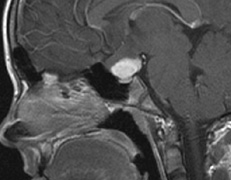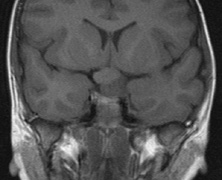 The incidence of optic pathway gliomas in NF1 is difficult to estimate, as the majority are asymptomatic and do not affect vision. In NF1, radiographic evidence of an optic nerve glioma occurs in 15% of patients.64,65 Most tumors are neither suspected historically nor detected by ophthalmic examination.65 Even when optic nerve gliomas become clinically detectable, visual function often remains stable in the absence of any intervention.66,67 Thus routine computed tomography (CT) imaging, even in patients with a known optic nerve glioma, is controversial. The potential risks of repeated radiation exposure in a child with a tumor-suppressor gene defect is a consideration. MRI studies are more revealing than CT but may require sedation or anesthetic and are costly. An MRI is often recommended at the time of diagnosis, but in most cases routine “follow-up” MRIs are unnecessary. Annual ophthalmic clinical examination for relative afferent pupillary defect (RAPD), visual acuity, visual fields, color vision, and funduscopy is usually all that is required, as no therapeutic action is likely to be taken unless there is significant and progressive visual involvement. Optic nerve gliomas may involve the optic chiasm and be associated with endocrine disorders or nystagmus.68–70 Surgical excision of chiasmal gliomas (Fig. 6) carries a high risk of visual loss. Invasion of the hypothalamus or the third ventricle carries a poor prognosis, with greater than 50% 15-year mortality rate.71 One review of radiation treatment for chiasmal gliomas collated data from small case series and found no significant long-term improvement in visual function, progression, or mortality with radiation treatment.71 Other reports suggest that radiation doses over 4500cGy improve symptoms and slow progression of chiasmal gliomas over several years.72 Adequate tumor coverage by radiotherapy results in irradiation of normal brain and nearly all children need hormone replacement.73 Chemotherapy is an alternative.74,75