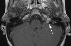 first used in 1936.166 The first major clinical criteria for the syndrome were proposed in 1964.167 The main manifestations of von Hippel-Linau syndrome are: histologically similar hemangiomas of the retina and CNS, renal cysts, renal cell carcinomas, pancreatic cysts, pheochromocytomas, and endolymphatic sac tumors.13 EPIDEMIOLOGY The prevalence of VHL syndrome is about 1 in 35,000 to 40,000.168 It is autosomal dominant with greater than 95% penetrance by age 60 years.169 Its expression, even within the same family, may be quite variable, especially for renal disease and pheochromocytoma.170,171 SYSTEMIC FEATURES Cutaneous Findings Cutaneous findings are not part of the diagnostic criteria for VHL syndrome. Neurologic Findings CNS hemangiomas are the most common tumor of VHL, affecting 60% to 80%, with a predilection for the cerebellum and spinal chord. An enlarging cystic component is a frequent finding in symptomatic tumors. Patients typically present in their early 30s; headaches or neck pain in affected individuals should not be ignored.172,173 On microscopy, CNS hemangiomas resemble retinal capillary hemangiomas. Their malignant potential is low.174 The treatment is surgical (Fig. 17, A and B).13 Endolymphatic sac cystadenomas are a sensitive marker of VHL. Patients may present with hearing loss, tinnitus, disequilibrium or facial nerve palsy.175,176 Visceral Findings KIDNEY. Renal cysts are often asymptomatic and do not require treatment. However, complex cysts may carry a risk for malignant transformation. Renal carcinoma affects about a third of patients. Patients typically present in their late 30s. These tumors may be completely asymptomatic, underscoring the necessity for ultrasound screening.13,177 ADRENALS. Pheochromocytomas are benign neural crest tumors of the adrenal medulla (chromaffin cell derived) and probably affect 10% to 20% of patients. Mean age at diagnosis is at about 30 years of age. Pheochromocytomas may be multiple and bilateral. They are catecholamine-secreting tumors that classically produce severe hypertension and anxiety attacks, but they may also be asymptomaic.178 The National Cancer Institute classification of VHL syndrome is in part based on the absence (type I) or presence (type II) of pheochromocytoma (Table 5).171
