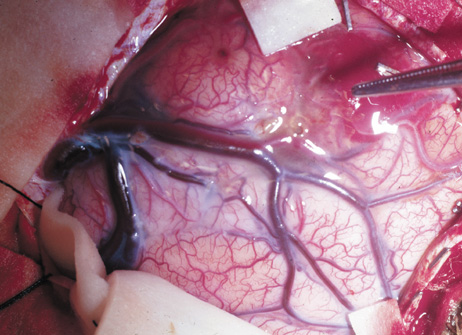The PWS may not entirely respect the midline, possibly a reflection of transmedian innervation.212 The lesion grows proportionally with the child, often becoming darker in color. 213 The overlying skin may develop nodularity or hypertrophy in two-thirds of patients (by the fifth decade).214 Treatment with a pulsed-dye laser may significantly improve the appearance, but recurrence (i.e., redarkening) is possible.215,216 A deficit in the number of perivascular nerves in port-wine stains suggests that abnormal neural modulation of vascular flow may be involved in their pathogenesis.217 Intracranial leptomeningeal capillary vascular malformation (Figs. 21 and 22) is associated with seizures and contralateral neuromuscular weakness. Central nervous system involvement correlates highly with ipsilateral involvement of the V1 dermatome by a PWS.208,218