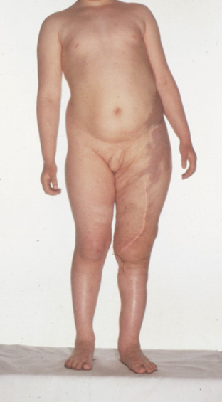 It has been hypothesized that the calcific changes reflect cellular anoxic injury secondary to venous stasis/poor drainage.219,220 Abnormal autonomic innervation has also been reported in association with the malformed cortical vessels—innervation only by noradrenergic fibers.221 Studies suggest that the normal increase in brain-blood flow to accommodate increased metabolic demand during seizure activity is blunted in affected brain regions of SWS.222 Thus, seizures in the setting of impaired perfusion may be exacerbating brain injury. Periods of contralateral weakness (days to weeks) can follow a prolonged seizure episode.206,223 When seizures begin early in life, the risk of developmental delay is much higher. In a review of 171 patients with a facial PWS and associated intracranial vascular malformation, 80% were found to have a seizure disorder. Of those, 75% with seizures had an onset during the first year of life, rising to 95% before age 5 years. Nearly all patients had a PWS that included (or was limited to) the V1 distribution. Developmental delay was strongly associated with seizures (71% of children with seizures as compared to 6% without seizures).224 Glaucoma affects 50% to 70% of SWS patients224,225 and it is a therapeutic challenge. From the time of diagnosis, the intraocular pressure, the optic discs, and the corneal diameters need to be measured intermittently, even if an occasional examination under anesthetic is required. The development of glaucoma appears to follow a bimodal age distribution: early-onset/congenital-type and later-onset. The glaucomatous eye is nearly always on the same side as the PWS.224 The highest risk for glaucoma appears to be when the PWS involves both the upper and lower lid: 72% vs. 21% for VI-only (upper eyelid) involvement in one study.224 The bimodal age distribution of glaucoma suggests that more than one mechanism is involved. Angle abnormalities (“trabeculodysgenesis” with or without flat anterior iris insertion) have been reported in association with the early-onset/congential type.225 Other proposed mechanisms include uveal capillary dilation226 and elevated episcleral venous pressure. Reports of blood in Schlemm's canal on gonioscopy support the idea of increased episcleral venous pressure pathomechanics.227,228 Glaucoma in SWS often responds poorly to medical therapy alone. The “trabeculodysgenesis” of early onset Sturge-Webber glaucoma is reported to be similar in gonioscopic appearance to primary congenital glaucoma.229 On this basis, goniotomy was suggested as a treatment of choice in early-onset SWS glaucoma. One group looked at the success of goniotomy, trabeculotomy, trabeculectomy, laser trabeculoplasty and medication in the management of SWS-associated glaucoma.230 In the early onset subgroup receiving goniotomy, median stable interval of intraocular pressure reduction after one procedure was 8 months; with multiple goniotomies and the addition of medical treatment, the median stable interval was extended to 9 years. Other investigators have found that goniotomy alone may be insufficient, requiring filtering surgery at some point. However, trabeculectomy carries a significant risk of choroidal expansion in association with hypotony. Theoretically, the risk may be higher when there is increased choroidal vascularity in association with the facial PWS—a “tomato ketchup” fundus.231 Often, there is associated increased tortuosity of the retinal vessels as well. Placement of a prophylactic posterior sclerotomy prior to filtering surgery to prevent choroidal expansion is controversial.232 Cryo- or thermocoagulation of the ciliary body in combination with medical therapy may be an alternative to surgery.233 KLIPPEL TRENAUNAY—WEBER SYNDROME Klippel-Trenaunay syndrome consists of combined capillary, lymphatic, and venous malformations, in association with varicosities and limb enlargement (Fig. 23). In the majority of cases, the lower limb is affected.234,235