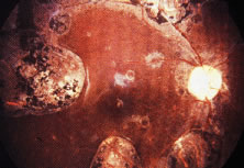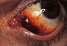 Ocular infections with bacteria after BMT are uncommon, perhaps in part because of routine, intensive antibiotic use when there is any evidence of infection after the procedure. Fungal endophthalmitis was found after BMT in only 1.5% of patients in one report; viral (CMV or varicella-zoster virus) or toxoplasmic retinochoroiditis was even less common.334 Fungal infections tend to occur in the first 4 months after BMT, whereas viral and parasitic infections occur later.334 Intraocular infections may have atypical features, and vitreous or endoretinal biopsy may be necessary to make a definitive diagnosis.334 Early relapse of leukemia may simulate fungal endophthalmitis.334 Cataracts develop in 10% to 23% of patients after BMT.335–338 Even though GVHD alone may be a risk factor for cataract formation, the medications used in conjunction with BMT, in particular corticosteroids, as well as total body irradiation, are probably more important factors.336–338 The use of fractionated total body irradiation has markedly reduced the frequency of cataracts after BMT.337 An occlusive retinal microvasculopathy has been described in 4% to 10% of patients after BMT.326,334,339 It appears to be more common in patients treated for leukemia, and there have been suggestions that it may be related to the use of total body irradiation, cyclosporine, or cytarabine hydrochloride; in one series, however, it was related most strongly with GVHD.334,339,340 Optic disc edema may be seen after BMT and has been thought to be an idiosyncratic reaction to cyclosporine use in some cases.341 Other causes of optic disc edema, such as meningitis, intracerebral hemorrhage, and relapse of leukemia in the CNS should be considered in the differential diagnosis. Other ocular findings of GVHD include cicatricial lagophthalmos, ectropion following lichenification of the skin of the eyelids, pseudomembranous conjunctivitis (see Fig. 7), corneal ulcers, iritis, and histologic evidence of choroiditis.328,329,342 Subconjunctival, retinal, and vitreous hemorrhage may occur early in the posttransplant period, as a result of induced bone marrow aplasia, but the risk of vision loss is low.334 Ocular problems do not usually develop in patients who survive BMT without developing severe GVHD, but patients with chronic GVHD and dry eye have a low probability of recovery of normal tear function.329 Continued treatment of dry eye is therefore usually necessary. |
