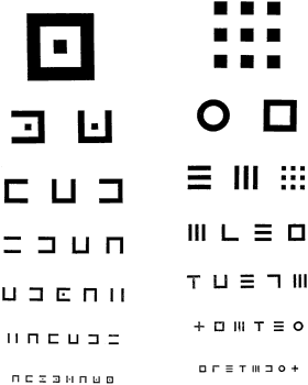 1974. In the 1960s, the WHO had surveyed national definitions of legal blindness and found that 65 countries used as many different definitions. In 1974 the World Health Assembly approved the 9th Revision of the International Classification of Diseases (ICD-9).28 In it, the old dichotomy between “legally sighted” and “legally blind” was abandoned for a series of (numbered) ranges of vision loss. In the same year, the International Council of Ophthalmology (ICO)29 adopted the same ranges, extended them to include normal vision and adopted the naming convention used in ICD-9-CM30 and here. 1976. In 1976, Ian Bailey and Jan Lovie (then at the Kooyong Low Vision Service in Melbourne) published a new chart31 featuring a novel layout with five letters on each row and spacing between letters and rows equal to the letter size. This layout standardized the crowding effect and the number of errors that could be made on each line. Thus, the letter size became the only variable between the acuity levels. Their charts have the shape of an inverted triangle and are much wider at the top than traditional charts. Like Sloan's chart, they followed a geometric progression of letter sizes. That same year, Hugh Taylor, also in Melbourne, used these design principles for an illiterate E chart,32 used to study the visual acuity of Australian Aborigines. He found that, as a group, Australian Aborigines had significantly better visual acuity than Europeans.14 This is another reason not to regard 20/20 visual acuity as “normal” or as “perfect” vision (see Fig. 4). 1982. Based on the above work, Ferris and col-leagues of the National Eye Institute chose the Bailey-Lovie layout, implemented with Sloan letters, to establish a standardized method of visual acuity measurement for the Early Treatment of Diabetic Retinopathy Study (ETDRS).33 These charts were used in all subsequent clinical studies and did much to familiarize the profession with the new layout and progression (Fig. 8). Data from the ETDRS were used to select letter combinations that give each line the same average difficulty, without using all letters on each line. 1984. The ICO approved a new Visual Acuity Measurement Standard, also incorporating the above features.23 |
