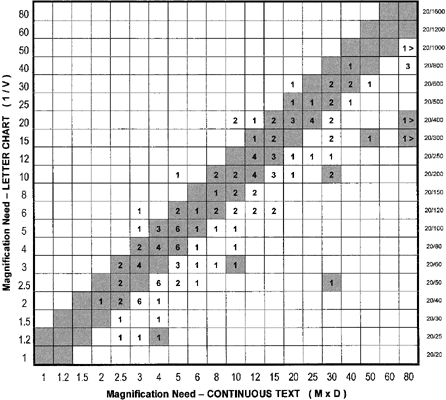 Many reading cards are calibrated for a specific reading distance (i.e., for a specific column in Fig. 14). This has led to the habit of using visual acuity values to refer to letter sizes. For instance, a letter size that would represent 20/100 at 40 cm might be referred to as a 20/100 letter. Figure 14 shows that the same letter at 25 cm would represent an entirely different acuity value. A 20/100 letter on a 20-foot chart is very different again. As visual acuity drops (M × D increases), subjects can compensate in two ways: they may move to a different column, bringing the same print size closer by increasing the reading add (or the amount of accommodation in younger people), or they can move to a different row, thereby enlarging the print size while maintaining the reading distance. Large-print books enlarge the physical print size; various magnification devices enlarge the virtual print size. Under most circumstances, letter chart acuity and reading acuity—if measured appropriately and with the proper refractive correction—are similar. However, when measuring letter chart acuity, subjects are often pushed for threshold or marginal performance, whereas reading tests more often aim at a level of comfortable performance. For this reason, the magnification requirement for reading acuity may be somewhat greater than that for letter acuity. The difference, known as the magnification reserve,47 is needed for reading fluency. While 20/20 (1.0) acuity implies the ability to read 1 M print at 1 meter, comfortable reading of newsprint (1 M) is generally done at 40 cm, indicating a 2.5× magnification reserve (four line intervals). Traditionally, the power of magnifiers is referenced to the ability to read at 25 cm (10 inches). One M at 25 cm denotes 20/80 (0.25). This is the top value in the low-vision band (see Table 3). To verify the relation between reading acuity and letter chart acuity, the two values were compared for 150 consecutive patients from my low-vision service. The results are shown in Figure 15. I found that a close relationship exists between letter chart acuity and reading acuity and that this relationship holds up at all visual acuity levels. Usually, the two are within one line from each other (diagonal gray band in Fig. 15); for some patients the magnification need for reading is larger than the magnification need for letter recognition (spread to the right of the diagonal). This difference is the magnification reserve, defined above. Since the objective of visual acuity measurement in the low-vision range is to help patients function with their own fixation ability, I do not push patients for maximum letter chart acuity by pointing to letters or by isolating letters (see the earlier discussion under choice of criterion). If I had used these techniques to improve the letter chart acuity, the magnification reserve for reading fluency would probably have appeared somewhat greater. Letter Size Notations for Continuous Text For letter charts with metric notation, the unit for letter size measurement is the M unit, as it was defined by Snellen and named by Sloan. A corresponding F unit for charts with feet notation was never defined and would probably only lead to confusion since calculating with nonmetric measurements is so much harder. The situation for continuous text letter sizes is more diverse. JAEGER NUMBERS. In the United States, Jaeger numbers are widely used. We have seen that these numbers have no numeric meaning since they refer to item numbers in a printing house catalog in Vienna in 1854. They cannot be used for calculations. Furthermore, since Jaeger did not establish an external reference, those who wanted to produce similar samples had to approximate Jaeger's samples with fonts that happened to be available at their local print shop. The result is great inconsistency in the use of Jaeger numbers. The first column in Figure 14 indicates the range of Jaeger ratings that were found to represent the same physical letter size on a number of contemporary Jaeger cards. Other countries have used similar samples, such as de Wecker samples in Germany and Parinaud samples in France. PRINTER'S POINTS. The need for a numeric designation lead some practitioners to the use of printer's points. This might have been useful if printer's points referred to the letter height; instead they refer to the height of the slug on which letters used to be mounted. On average, lowercase letters tend to be about 50% of the slug height. Thus, 1 point (slug height) = 1/72 inch However, this relationship varies with the type font. For example, in the TrueType (TT) family of computer fonts, an Arial letter of 8 points has the same size as a Times New Roman letter of 9 points. Another problem is that the point notation does not apply to the optotypes used for distance vision, so that comparison of far and near measurements is impossible. A AND N SERIES. On British type samples the size inprinter's points is designated by the notation N = .British cards often also carry an A = notation. The A series is based on the logarithm of the letter size. As such, it is related to the “letter size credit” mentioned in Figure 7 (A = 17 - [letter size credit] ÷ 5). M-UNITS. The M-unit is the only letter size unit that applies to distance charts as well as to reading samples, so it is the only unit that allows comparisons between the two tests. The M-unit is used in this chapter and on an increasing number of newer reading cards. It is convenient that 1 M is the size of average news print. By definition, 1 M-unit subtends 5 minutes of arc at 1 meter and equals 1.454 mm. Useful equivalents include the following: 7 M = 10 mm (error -2% or 0.1 line interval) and 1 M = 1/16 inch (error + 10% or 0.4 line interval). Based on the size of lowercase letters without ascenders or descenders (x-height), 8 points = 1 M for the TT Arial and TT Courier computer fonts, but for the TT Times New Roman computer font, 1