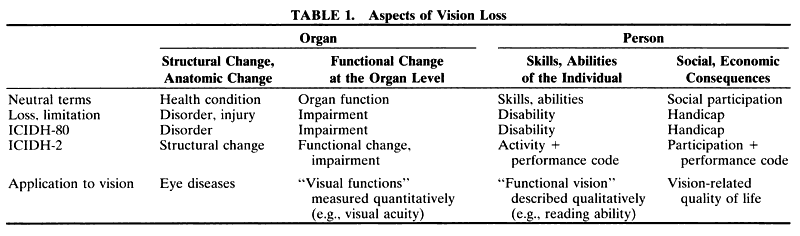 vision and the ability to perform ADLs are more difficult to measure. For administrative uses, a statistical estimate of the ADL ability can be derived from the visual function measurements. For individual rehabilitation plans, the individual abilities must be evaluated in an ability profile. Improving the participation aspect is the ultimate goal of all rehabilitative efforts. Instruments such as the NEI-VFQ can be used to assess this aspect. |