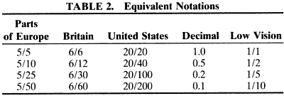CHOICE OF CONTRAST AND ILLUMINATION. Contrast and illumination both influence visual acuity. Fortunately, in the range of commonly used values, this influence is minimal. If contrast is reduced to a level where it affects visual acuity, we speak of a contrast sensitivity test, which is discussed elsewhere. If illumination is lowered to threshold values, we may speak of a dark adaptation test. Visual acuity is usually not affected until contrast drops below 20%. Normal visual acuity charts have contrasts of 80% or better. For use in a routine eye examination, projector charts in a dim or darkened room are generally preferred. In the United States, the average projector chart has a luminance of about 85 cd/m2; European charts are generally brighter, up to 300 cd/m2. The lower luminance has the advantage that the pupil may be wider, so that refractive errors may be more obvious; the brighter charts have the advantage that they suffer less from stray light, which causes contrast degradation. The ICO Visual Acuity Measurement Standard23 recommends a range that includes both the lower and the higher values. To predict the everyday performance of patients, a lighted printed chart in a lighted room is preferred. Front lighting is easiest to implement. Back lighting of a translucent chart on a light box gives the most even and most reproducible illumination. The usual backlit ETDRS chart has an illumination level of about 200 cd/m2. For patients with conditions such as albinism or rod dystrophy, it should be possible to reduce the illumination, which may result in a significant increase in visual acuity. A presentation method, which undoubtedly will gain more widespread use in the future, is presentation on a computer screen. This allows presentation of single letters, as well as presentation in a letter chart format. It also allows control over parameters such as crowding, contrast, and brightness. CHOICE OF VISUAL ACUITY NOTATION. The result of the visual acuity measurement can be recorded in a variety of ways. True Snellen Fractions. The notation promoted by Snellen was that of a true Snellen fraction, in which the numerator indicates the actual test distance and the denominator indicates the actual size of the letter seen. The advantage of this notation is that it indicates the actual test conditions. The disadvantage is that it becomes awkward to compare visual acuity values measured under different conditions. This is especially true for projector charts, where the projector magnification is often adjusted to accommodate fractional viewing distances. Snellen Equivalents. To overcome this difficulty, Snellen equivalents are used. In Europe, the decimal equivalent of the Snellen value is used most often. This notation is clear because there is no numerator or denominator. The notation becomes confusing when the decimal notation is converted back to a pseudo-Snellen fraction. For example,5/25 = 0.2 = 2/10; the 2/10 fraction would suggest that the subject saw a 10 M letter at 2 meters, instead of a 25 M letter at 5 meters. In the US Notation, a 20-foot fraction is usually used as a Snellen equivalent. For example, in an examination lane of 18 or 21 feet, the true Snellen fractions would be 18/18 or 21/21. Instead, the visual acuity is recorded as 20/20 in both cases. Thus, seeing 20 as the numerator of a visual acuity fraction rarely implies that the actual measurement was made at 20 feet. In Britain, the 6/6 notation is similarly used as a Snellen equivalent. Visual Angle Notation was used by Louise Sloan. It refers to the visual angle of the stroke width of 5 × 5 letters. Thus, 1 minute equals 20/20 (1.0), 2 minutes equals 20/40 (0.5), and so forth. The visual angle is the reciprocal of the visual acuity value and equals the denominator of the 1-meter Snellen fraction. Others have used the acronym MAR. In the context of physiologic optics, this term is usually interpreted as “minimal angle of resolution” and best describes grating acuity; in the context of psychophysics and clinical testing it might be better interpreted as “minimum angle of recognition,” while in the context of vision rehabilitation it might be interpreted as “magnification requirement.” Because higher MAR values indicate poorer vision, MAR should be considered a measure of vision loss. LogMAR Notation was introduced by Bailey.31 As the name implies, logMAR is the logarithm of the MAR value, thus converting a geometric sequence of letter sizes to a linear scale. Like MAR, logMAR is a notation of vision loss, since positive logMAR values indicate reduced vision, while normal vision (better than 20/20, 1.0) is indicated by negative logMAR numbers. Standard vision (20/20, 1.0) equals 0. On a standard chart, each line is equivalent to 0.1 logMAR; thus + 1.0 logMAR means 10 lines lost or 20/200 (0.1), and + 2.0 logMAR means 20 lines lost or 20/2000 (0.01). Since Bailey used the logMAR notation with a geometric progression of letter sizes, the term logMAR chart is often used to imply a geometric progression. This is not necessarily so; a logarithmic scale could be applied to any progression. The decimal values and reverse scale do not make the logMAR notation particularly user-friendly. For everyday clinical practice, Snellen equivalents are easier, since they relate directly to the measured quantities of letter size and viewing distance. The logMAR notation has gained widespread use in psychophysical studies, for statistical calculations, and for graphical presentation of the results of multicenter clinical studies. It provides a more scientific equivalent for the traditional clinical statement of “lines lost” or “lines gained,” which is valid only when all steps between lines are equal. Visual Acuity Rating (VAR; Bailey42) and Visual Acuity Score (VAS; Colenbrander43) are two names given to a more user-friendly equivalent of the logMAR scale. On the VAR or VAS, 20/20 (1.0) is rated as 100, 20/200 (0.1) is ra